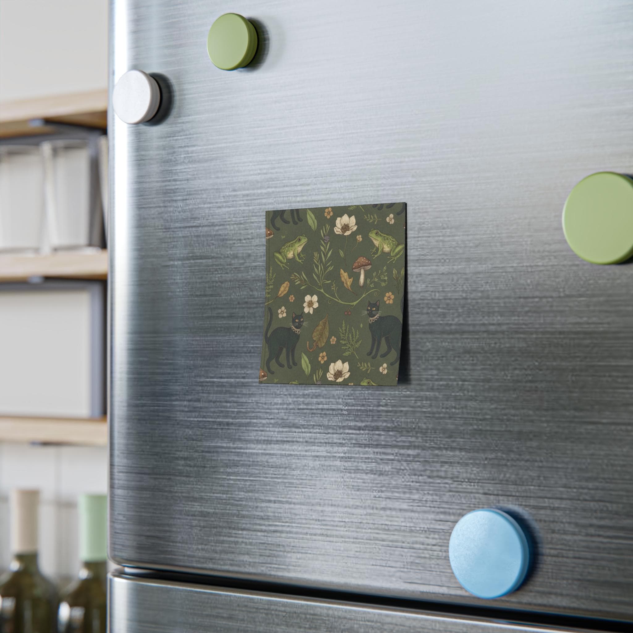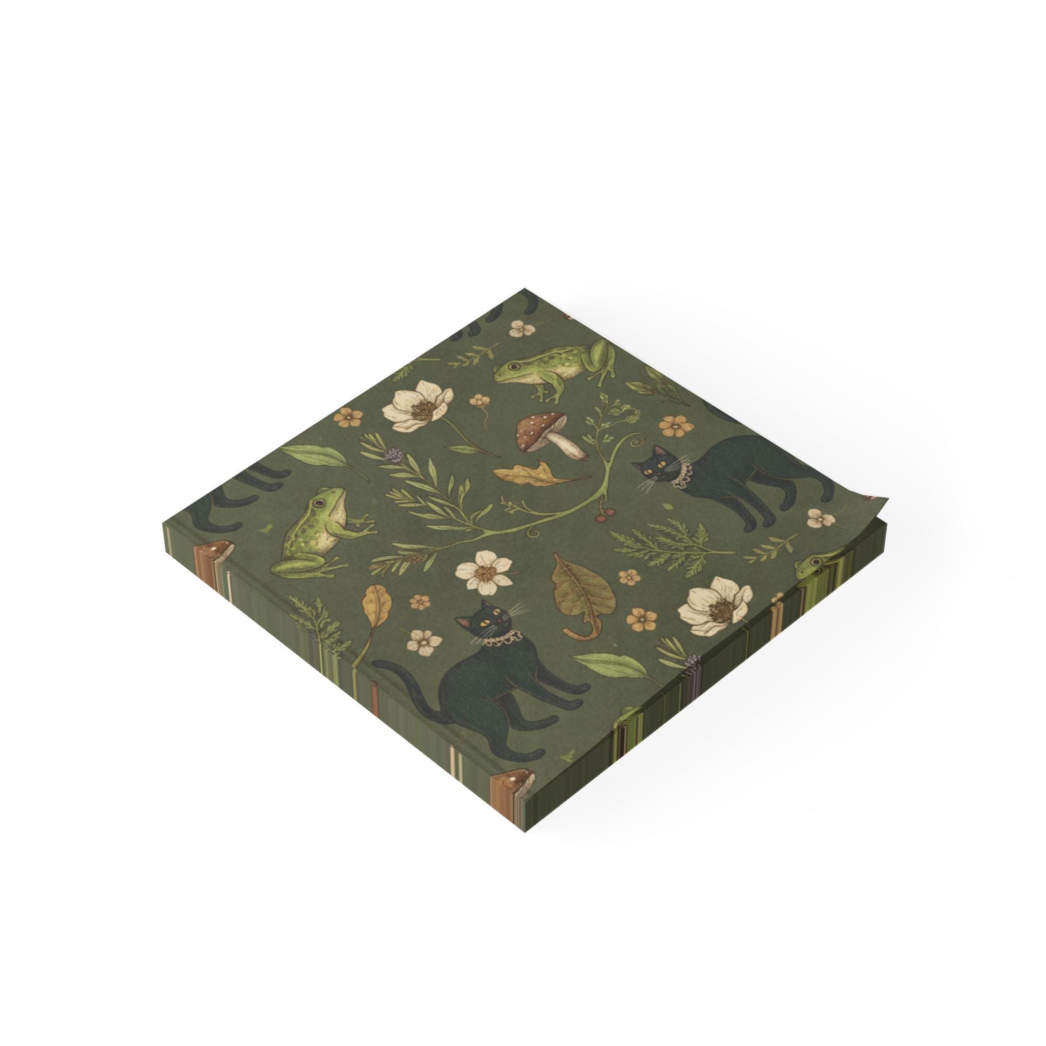Handy square note pads covered in a whimsical forest pattern where black cats slip between toadstools and green frogs perch on mossy leaves. These pads bring a little slow-morning magic to desks, kitchen counters, and nightstands—scribble reminders, grocery lists, or tiny spells across fifty crisp sheets. The matte white paper takes bright printing beautifully, so the deep olive background and warm earth tones read rich and clear. A branded Post-it® backing keeps the stack tidy and the 3M adhesive holds notes in place when you need them, but peels away cleanly when you don’t.