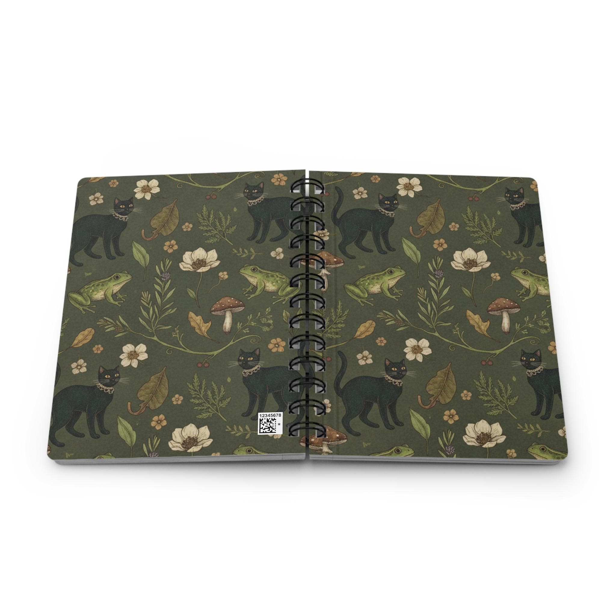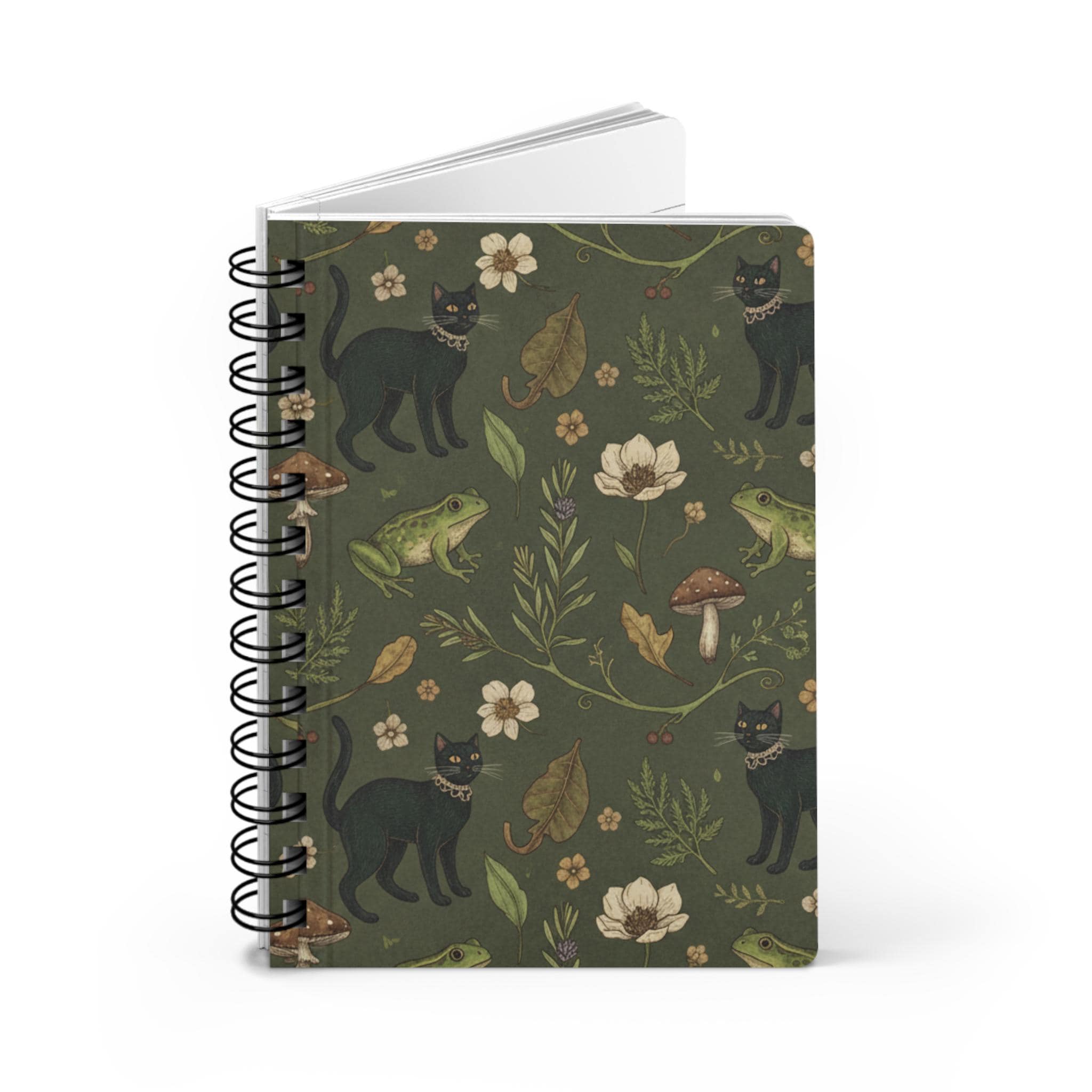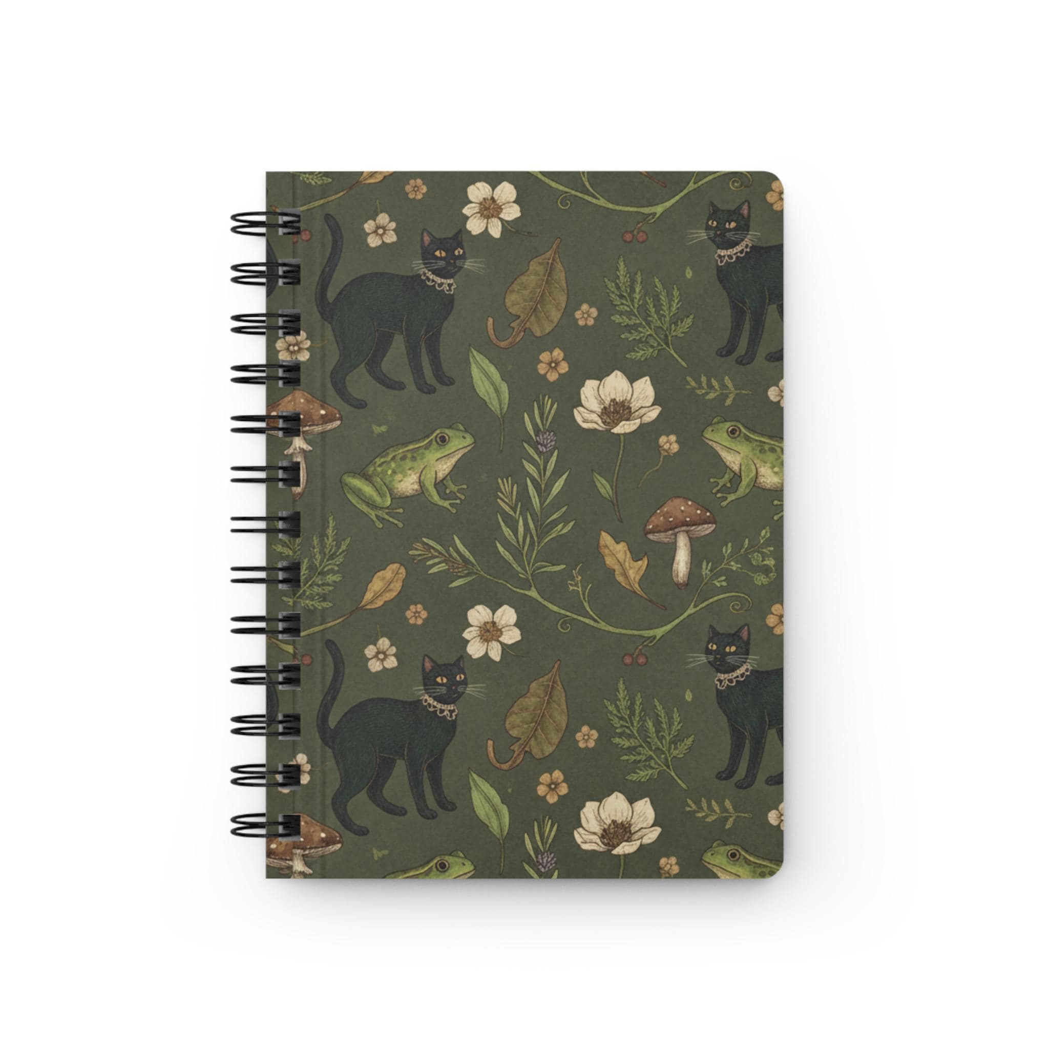 This spiral-bound journal carries a quiet, enchanted feeling — like a pocket of forest tucked into your bag. The deep, mossy background sets off hand-drawn frogs, curious black cats, mushrooms, and soft florals, inviting slow, thoughtful pages of notes, sketches, or plans. The glossy laminated cover keeps the artwork rich and protected through daily use, while the removable metal spiral lets you take pages out cleanly when the idea is finished or needs sharing. Inside, 150 lined pages on 90gsm paper give a smooth, satisfying surface for pens and pencils. It slips easily into a satchel for a walk in the woods, stays by the bedside for late-night thoughts, or lives on a desk as a small, whimsical companion to your everyday rituals.