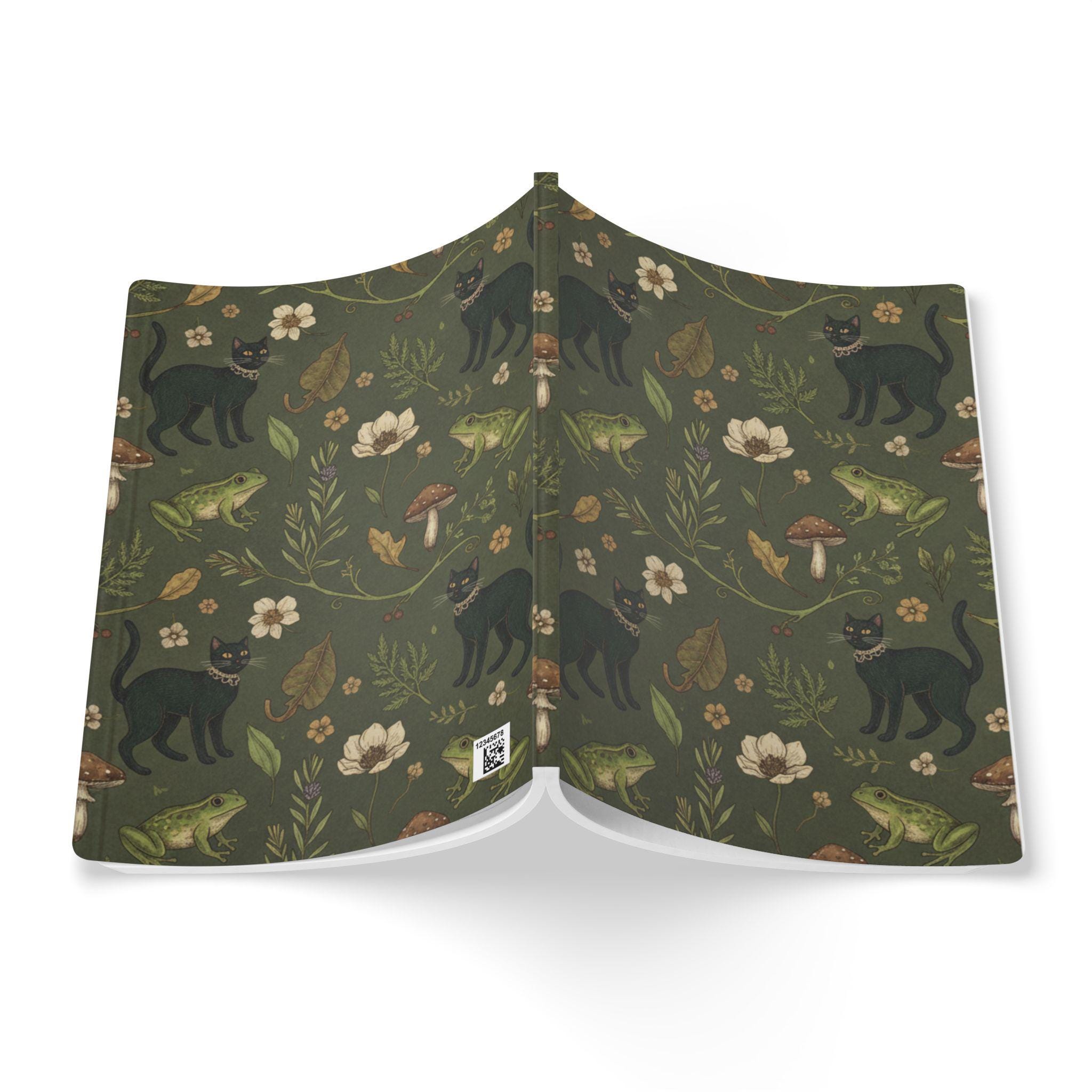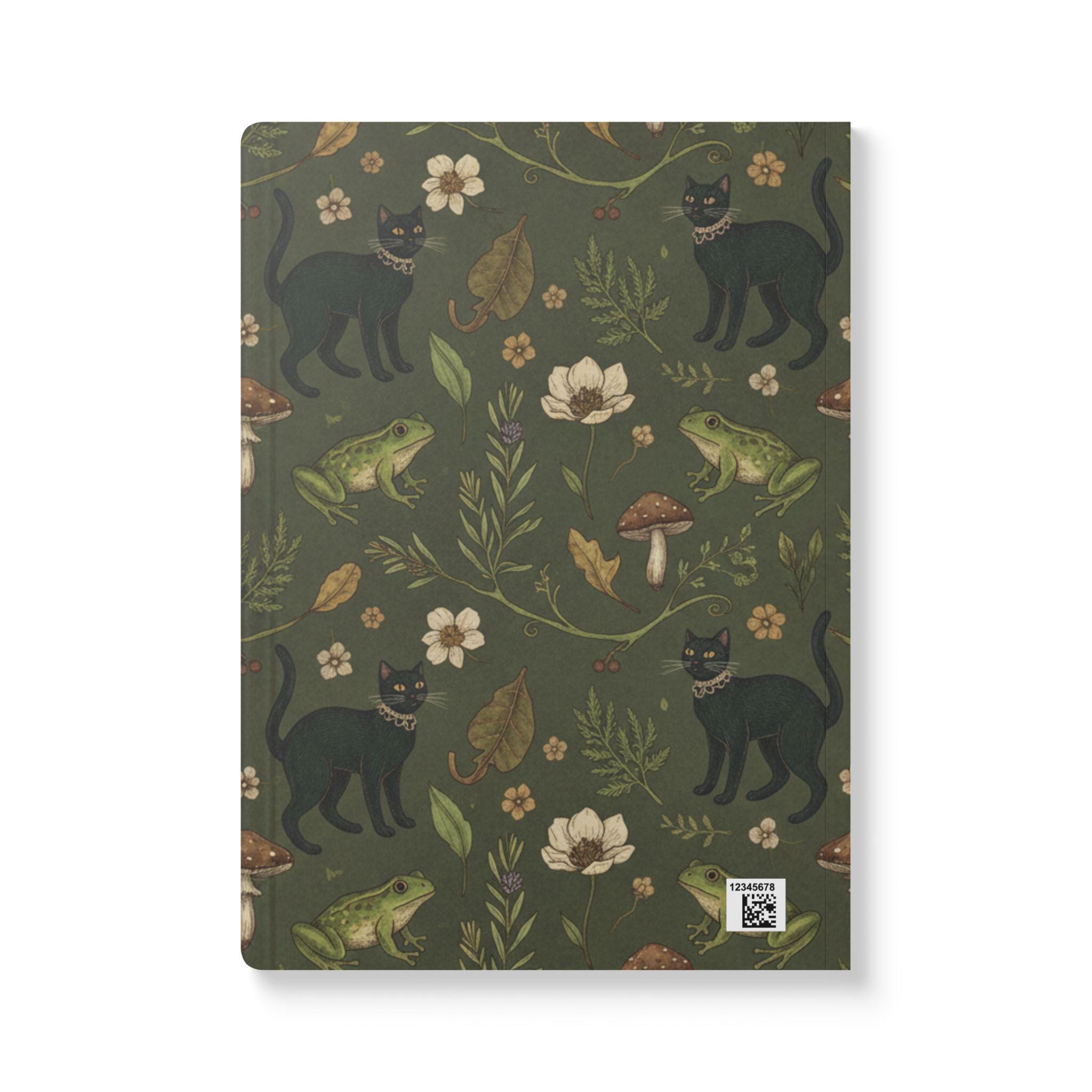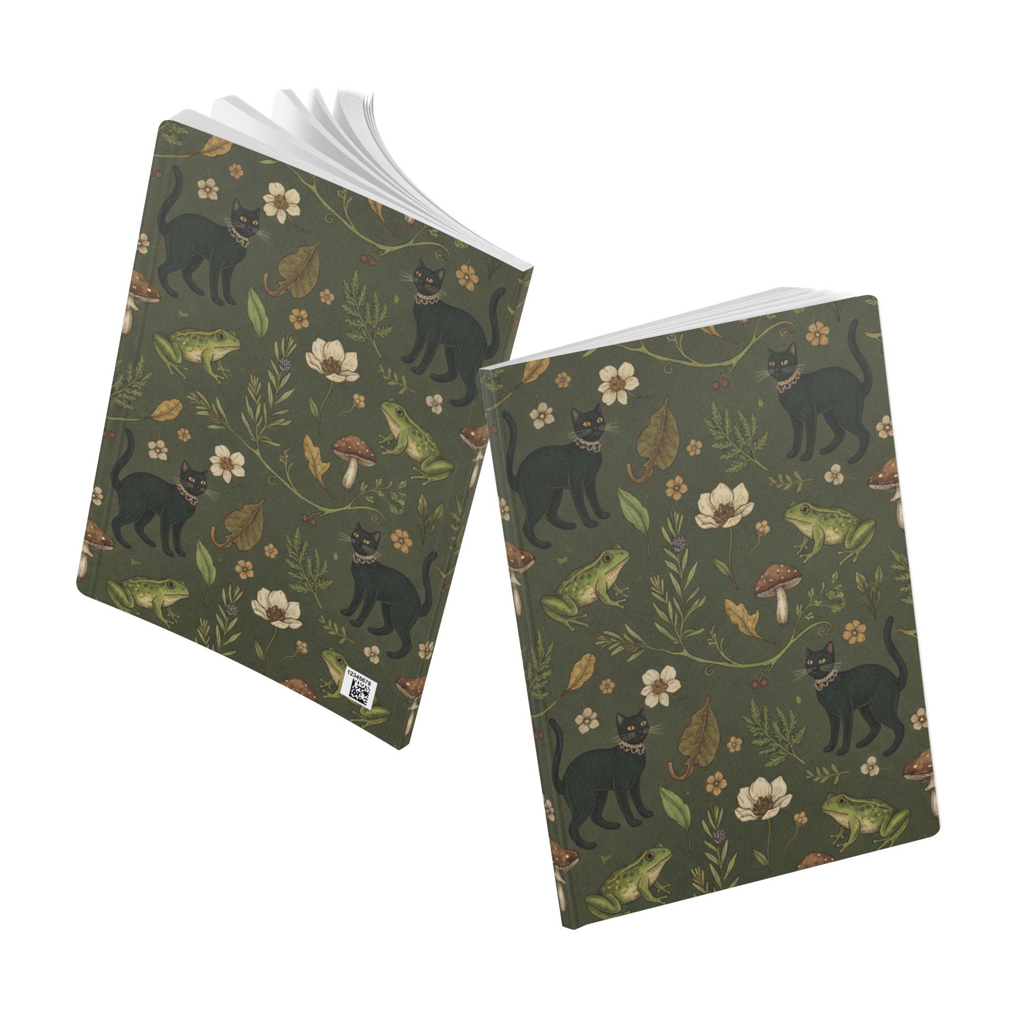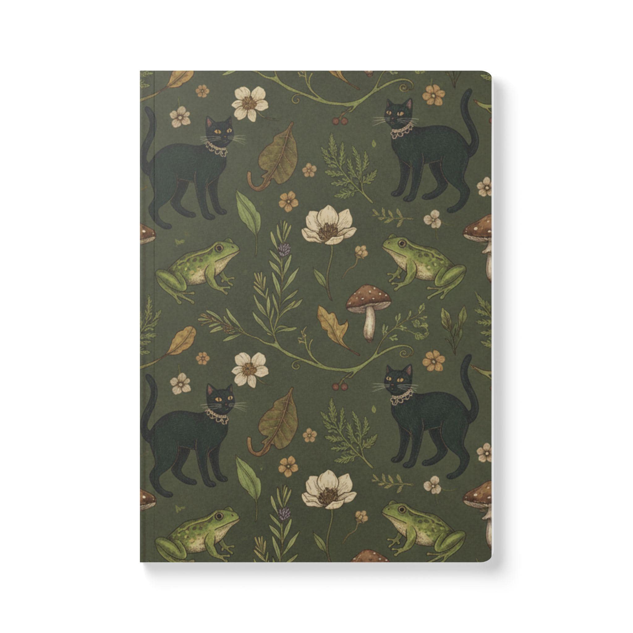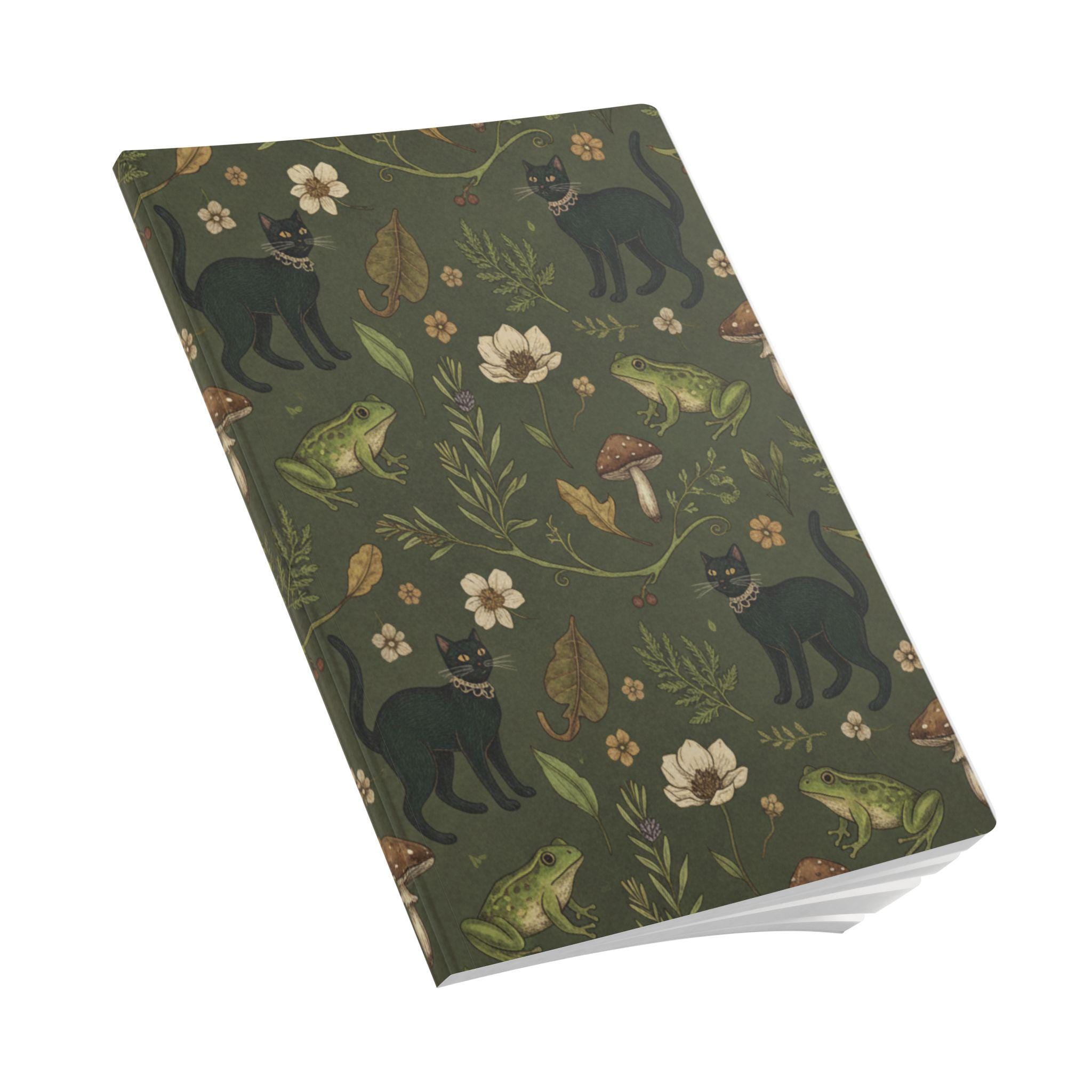 A softcover journal that invites quiet, everyday magic. The forest-green cover features a whimsical repeat of black cats, frogs, mushrooms and wildflowers rendered in warm, painterly tones — a little mysterious, gently nostalgic. Inside, bright, crisp printing keeps the inner artwork vivid while 80 lb (120 gsm) text paper takes both pen and light ink without bleed. Perforated pages let thoughts be shared or tucked away. Choose 100 or 200 pages and enjoy the smooth satin cover with rounded corners and six customizable inner pages for lists, trackers, or prompts. Assembled in the USA from globally sourced parts, this journal lives on a nightstand, in a tote, or beside a steaming mug as the place you record ideas, spells, sketches, and everyday observations.