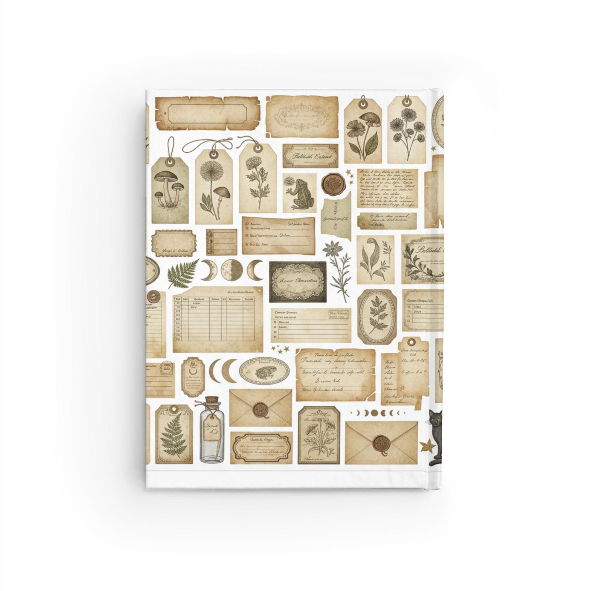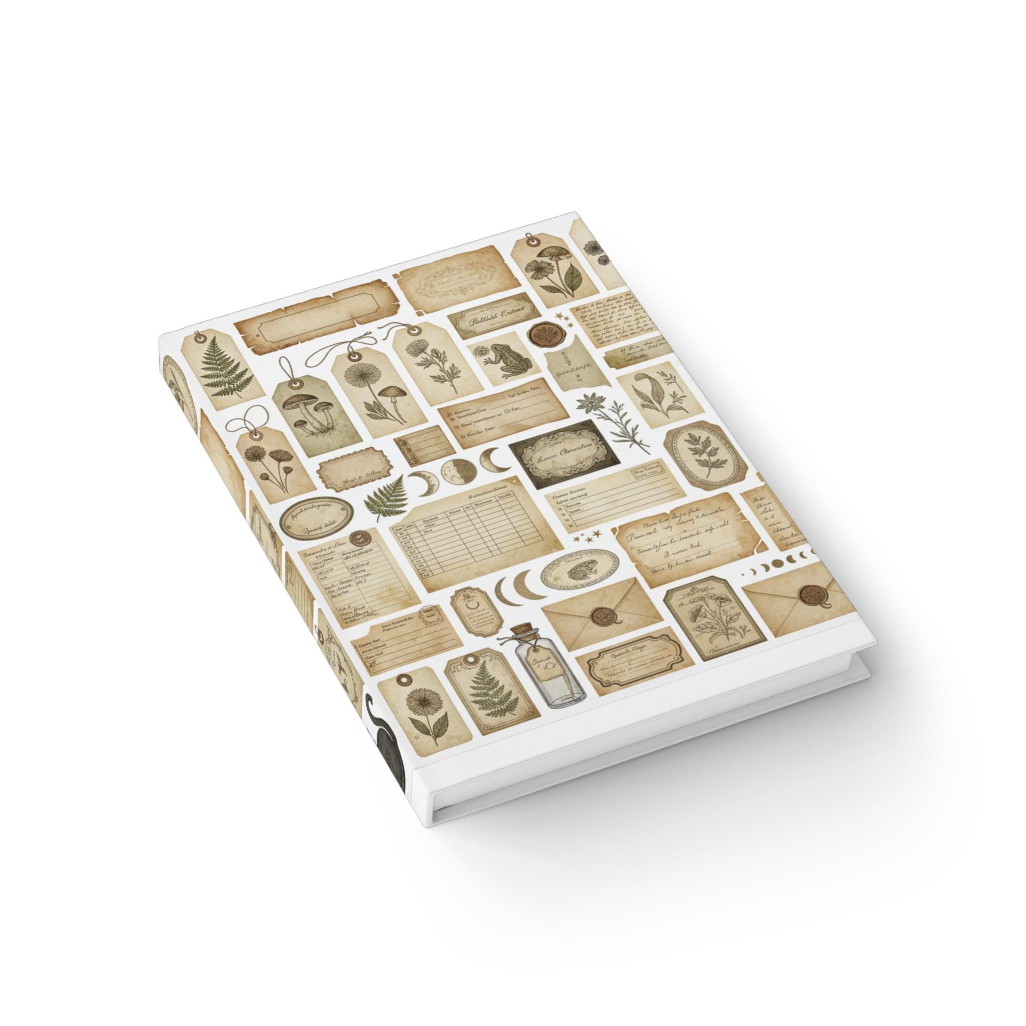 This 5" x 7" blank journal is a quiet companion for anyone who loves tactile, thoughtful pages. The matte laminated cover wraps a collage of vintage ephemera — pressed-plant tags, ledger scraps, moon phases, and handwritten notes — giving it an heirloom feel that invites slow reflection. Inside, 128 blank pages of 90gsm paper lie flat thanks to casewrap binding, so sketches, lists, and long-form thoughts flow without interruption. The compact size slips into a bag or sits on a bedside table, ready for morning pages, on-the-go observations, or collecting small rituals. It feels like a found notebook from another time — familiar, warm, and ready for new stories.