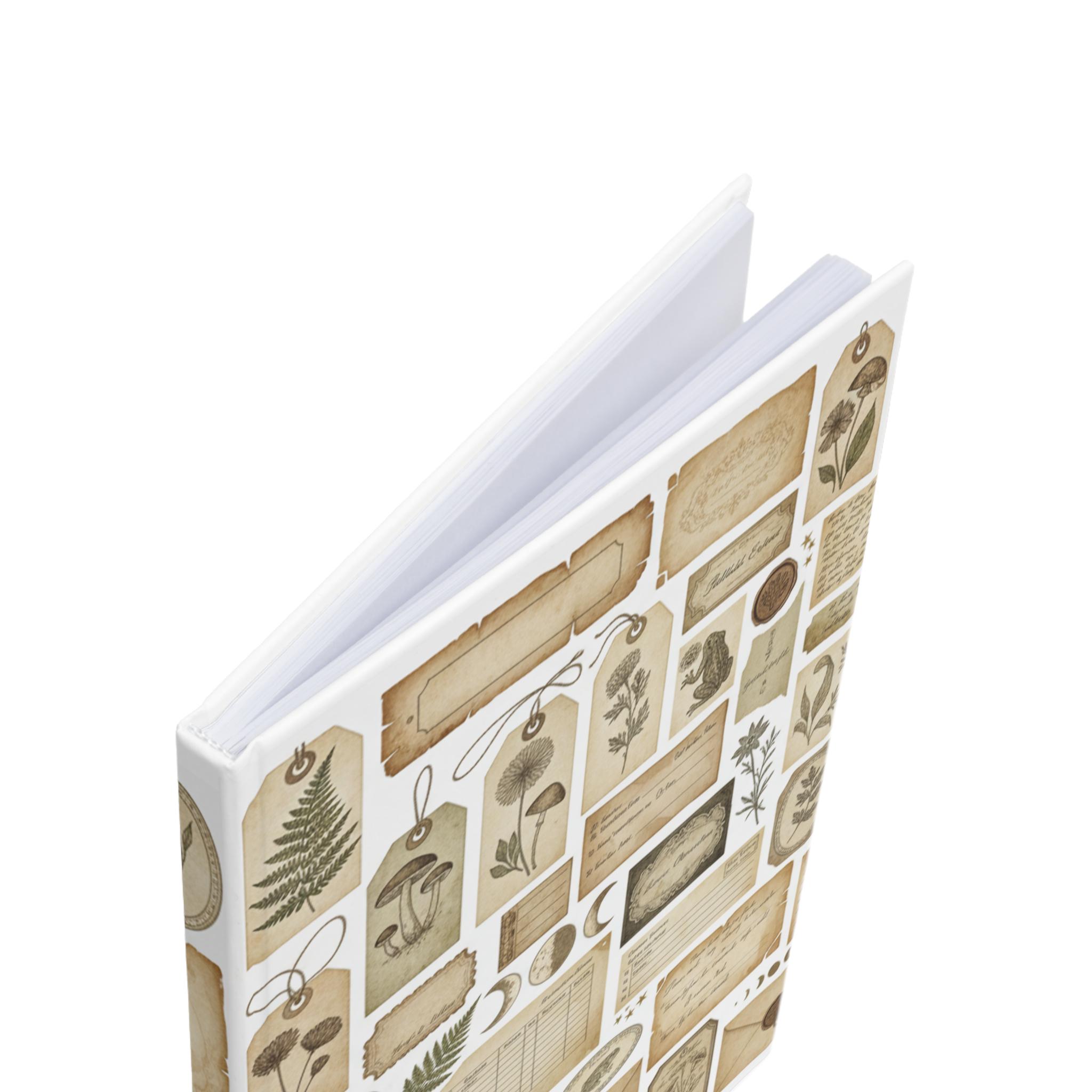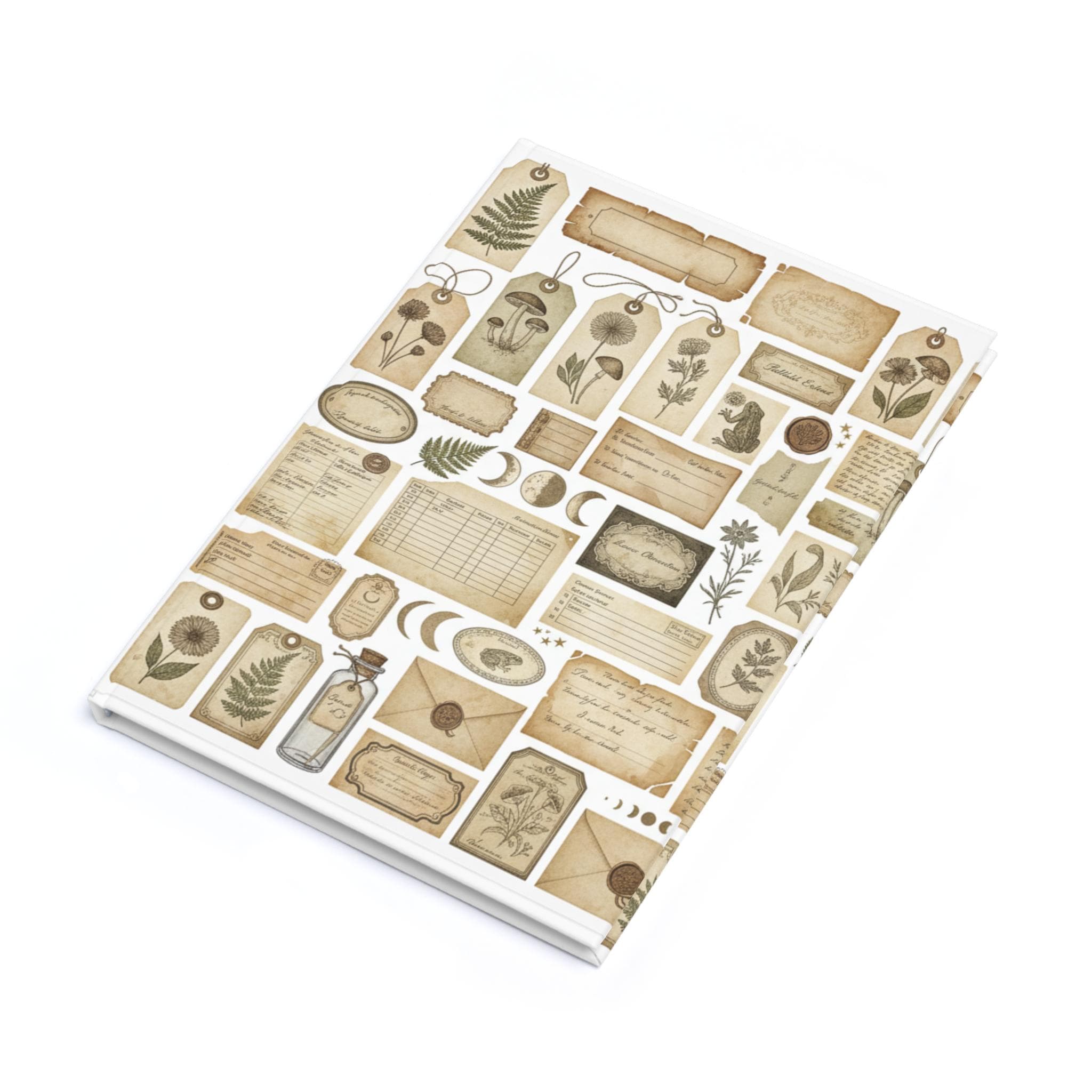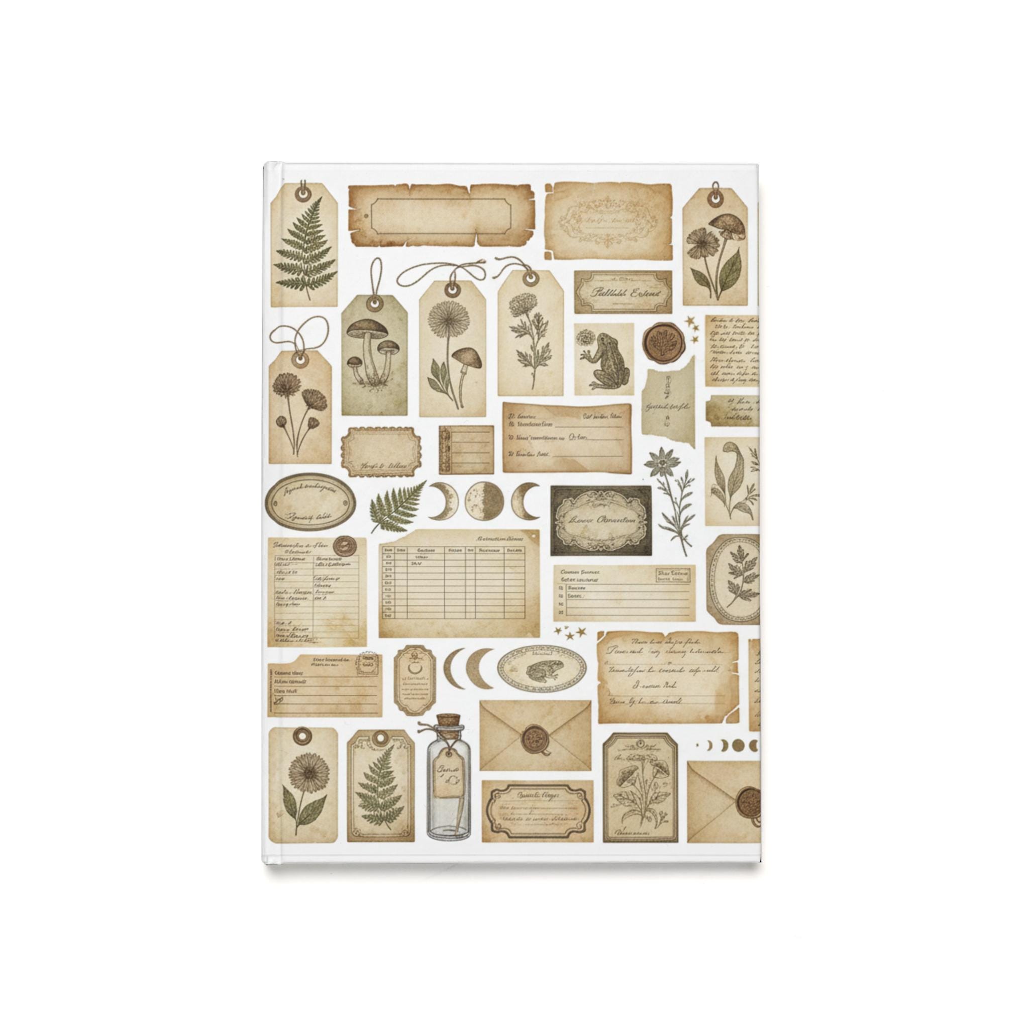 This hardcover journal wraps a pocket of gentle nostalgia around your daily notes. Softly aged tags, pressed botanicals, vintage letters and tiny moon phases scatter across the cover in warm sepia tones. It feels like a collector’s folio — the kind you tuck into a tote before a market, a walk through the woods, or an evening at a café. The sewn, casewrap binding lets the book open flat so your pen flows uninterrupted across the page. Use it for sketches, lists, seeds of poems, or to record garden plans and foraged finds. The quiet, tactile look invites slow, thoughtful entries and keeps your memories looking as cherished as they feel.