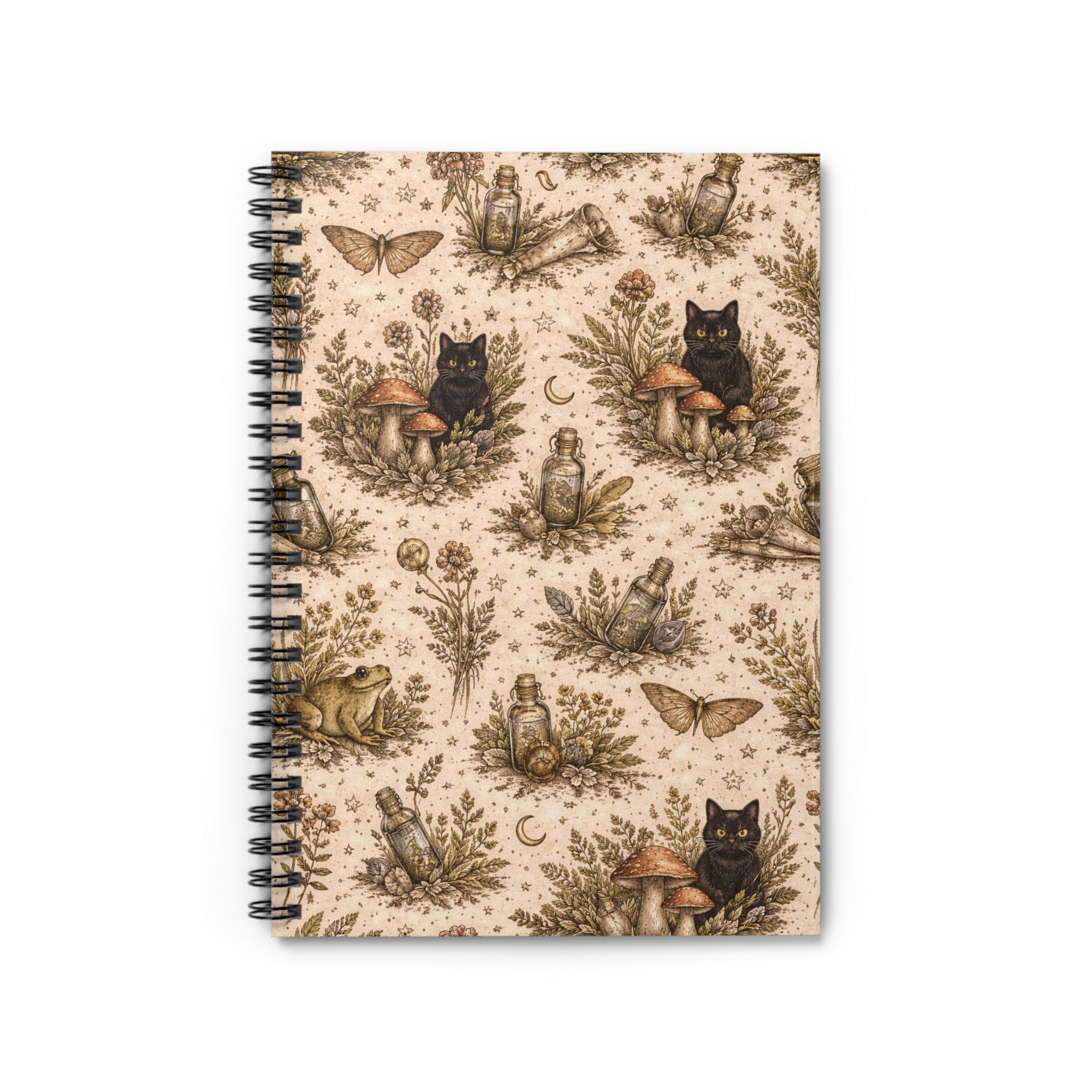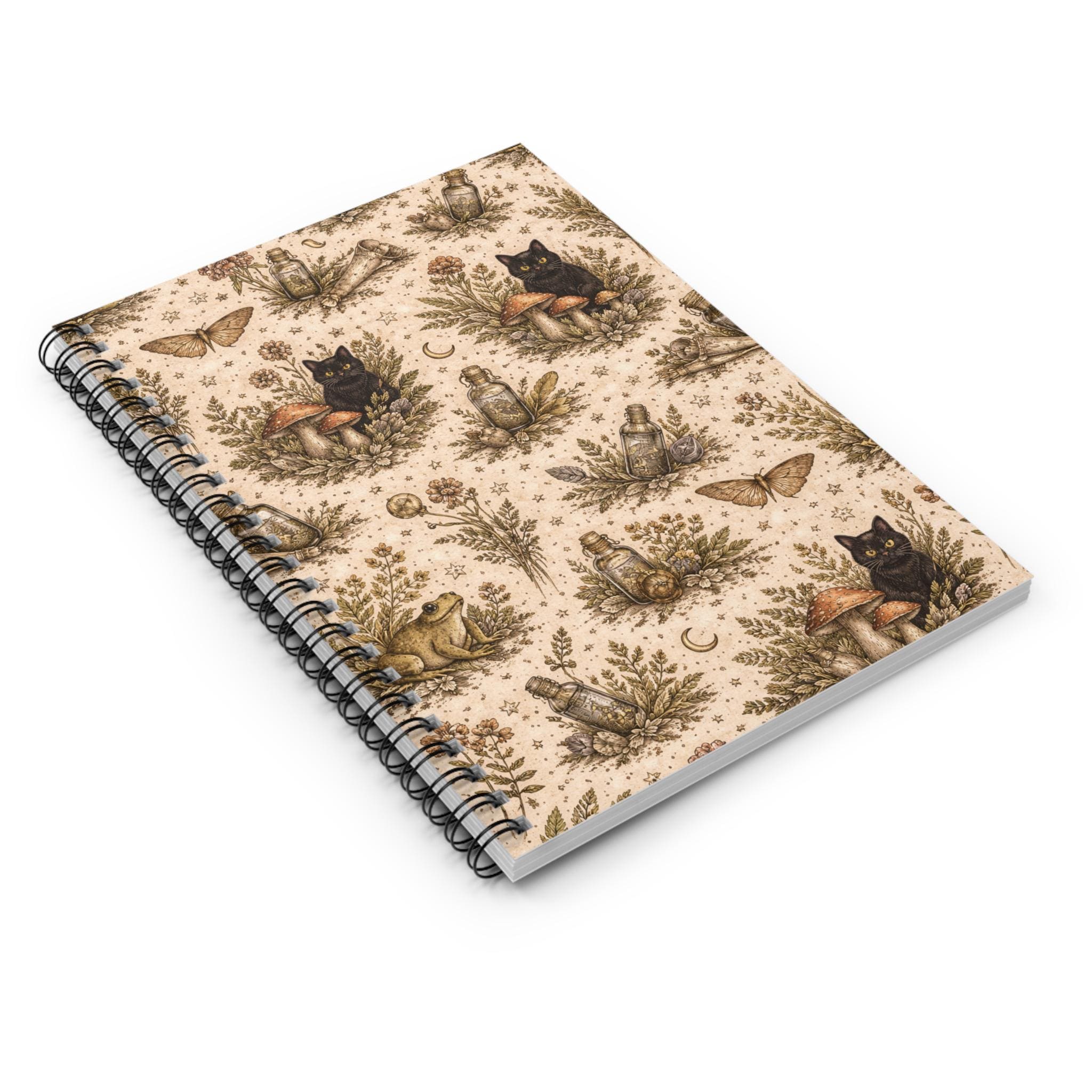 Soft, hand-drawn woodland scenes wrap the cover of this ruled spiral notebook, inviting slow handwriting, lists, and small rituals of reflection. Earthy browns, mushroom clusters, curious black cats, and vintage glass bottles give it a quietly witchy, cottagecore feel — a comforting place to jot spells, plans, sketches, or daily thoughts. The sturdy 350 gsm covers protect 118 lined pages of 90 gsm paper that take ink smoothly, while the metal spiral lays flat for comfortable writing and lets you tear out pages cleanly. An inner document pocket keeps loose notes, tickets, or pressed mementos safe. Compact at 6