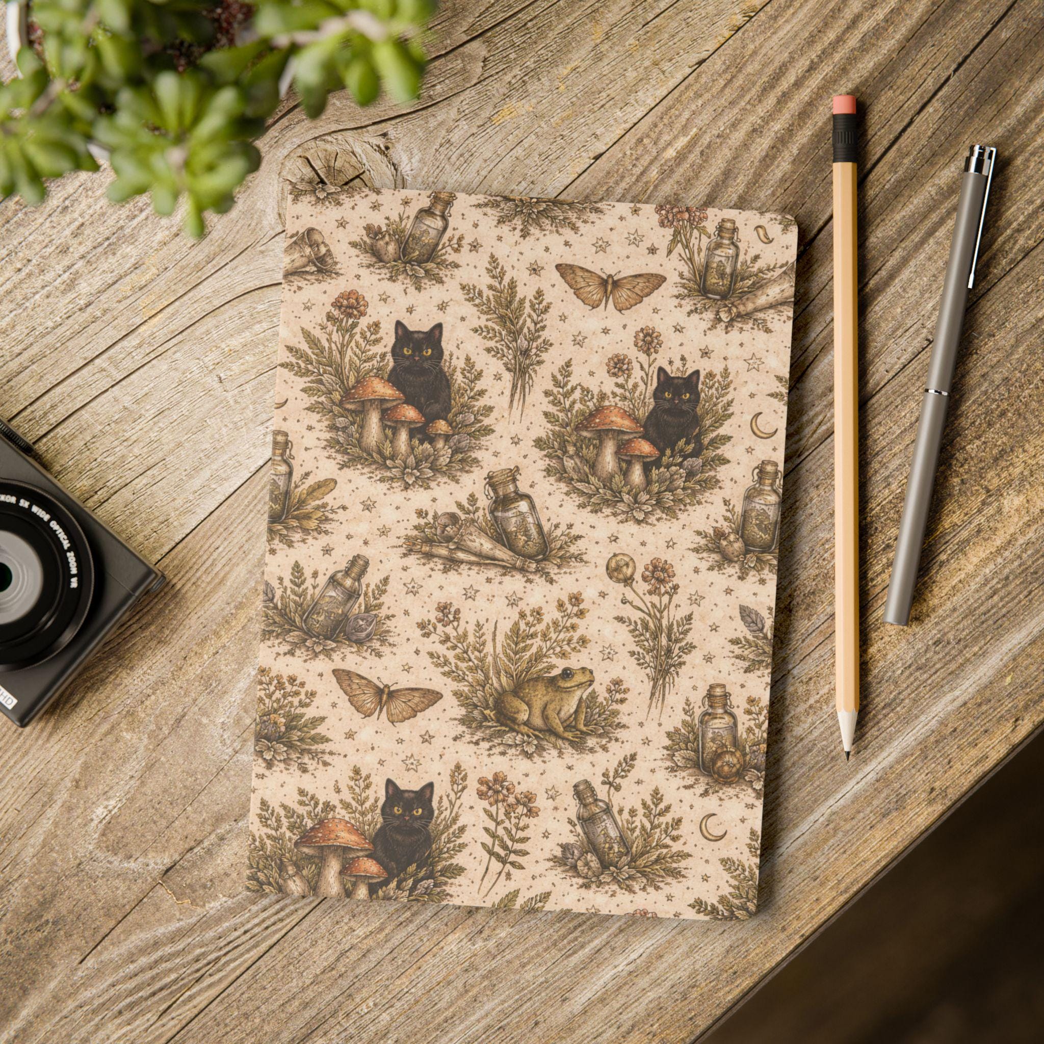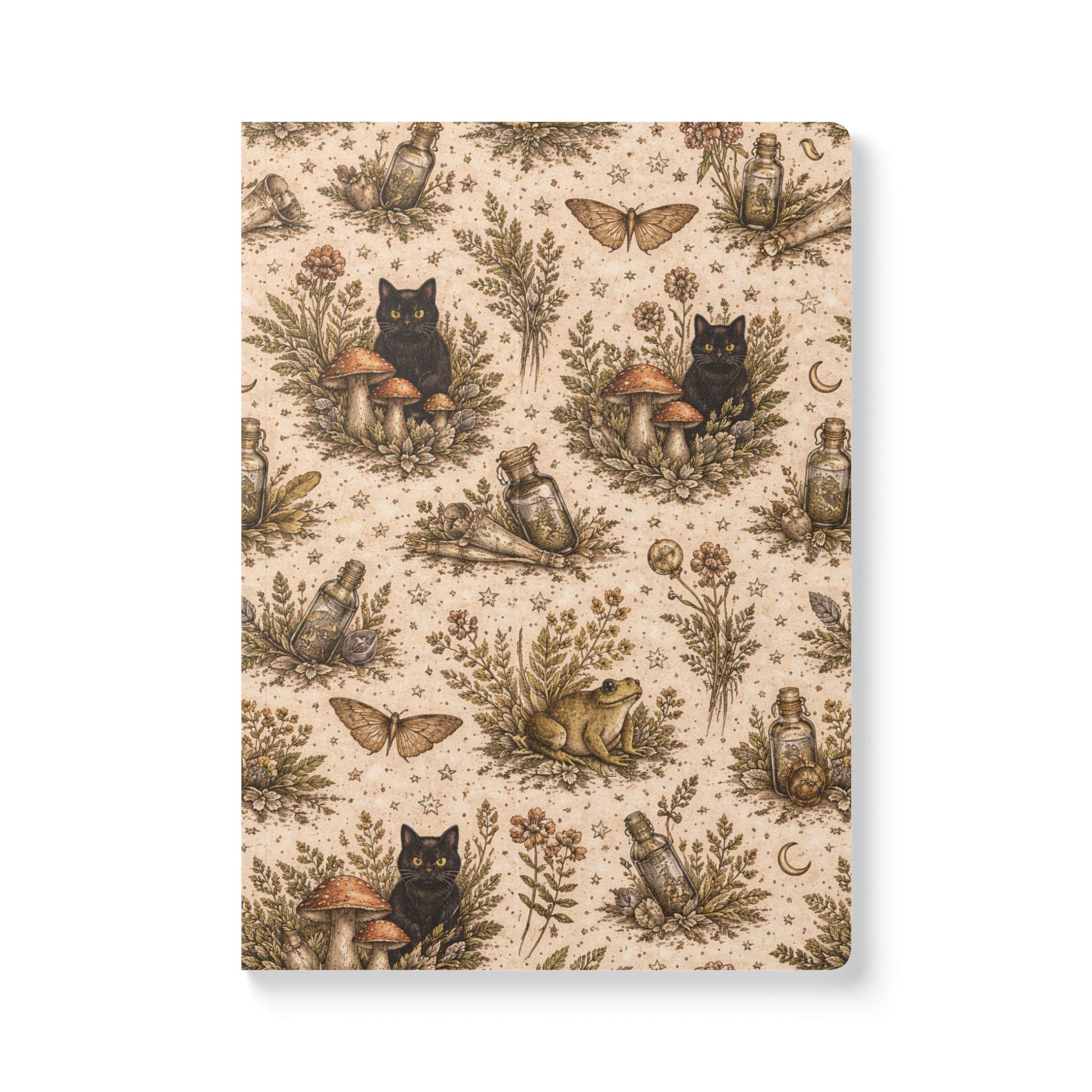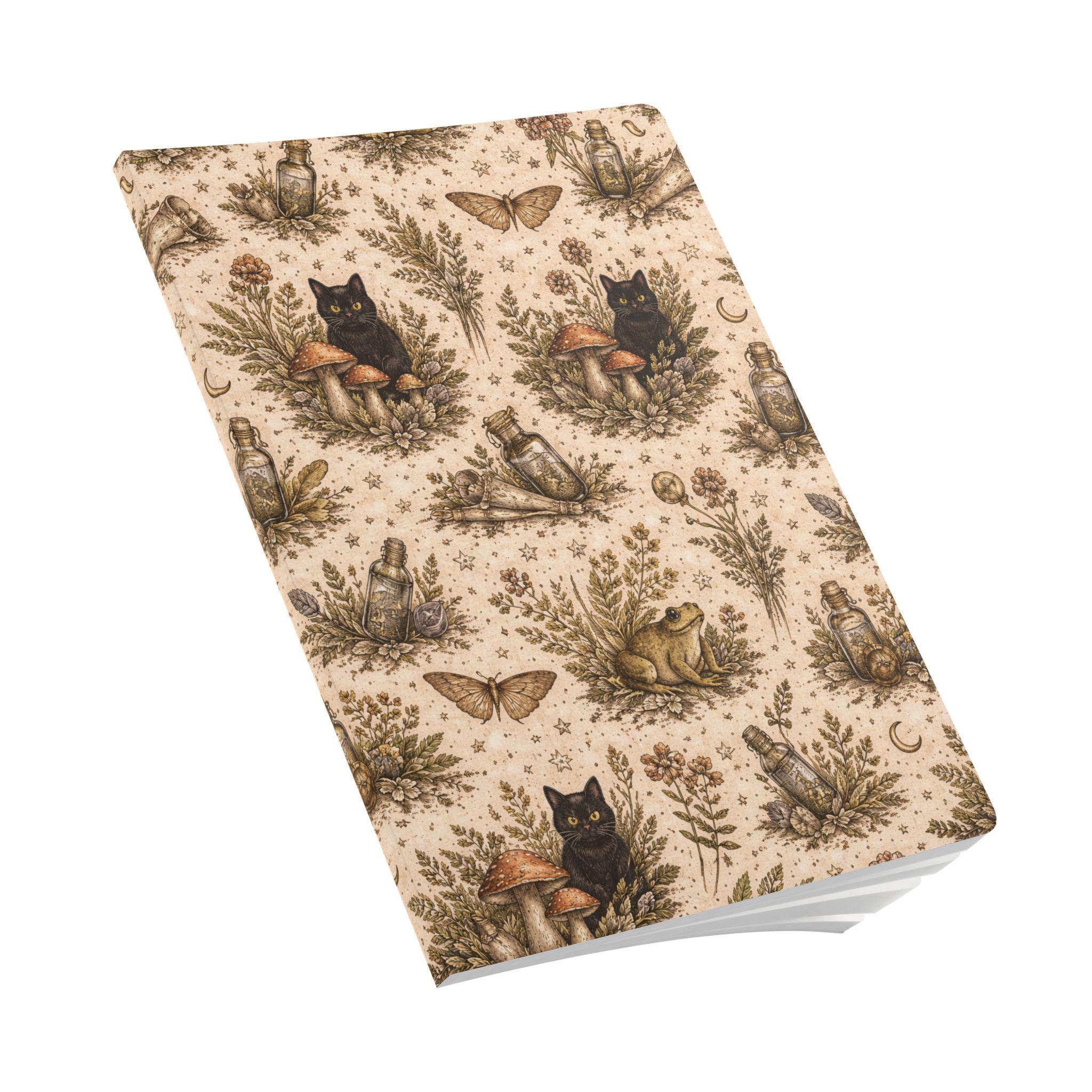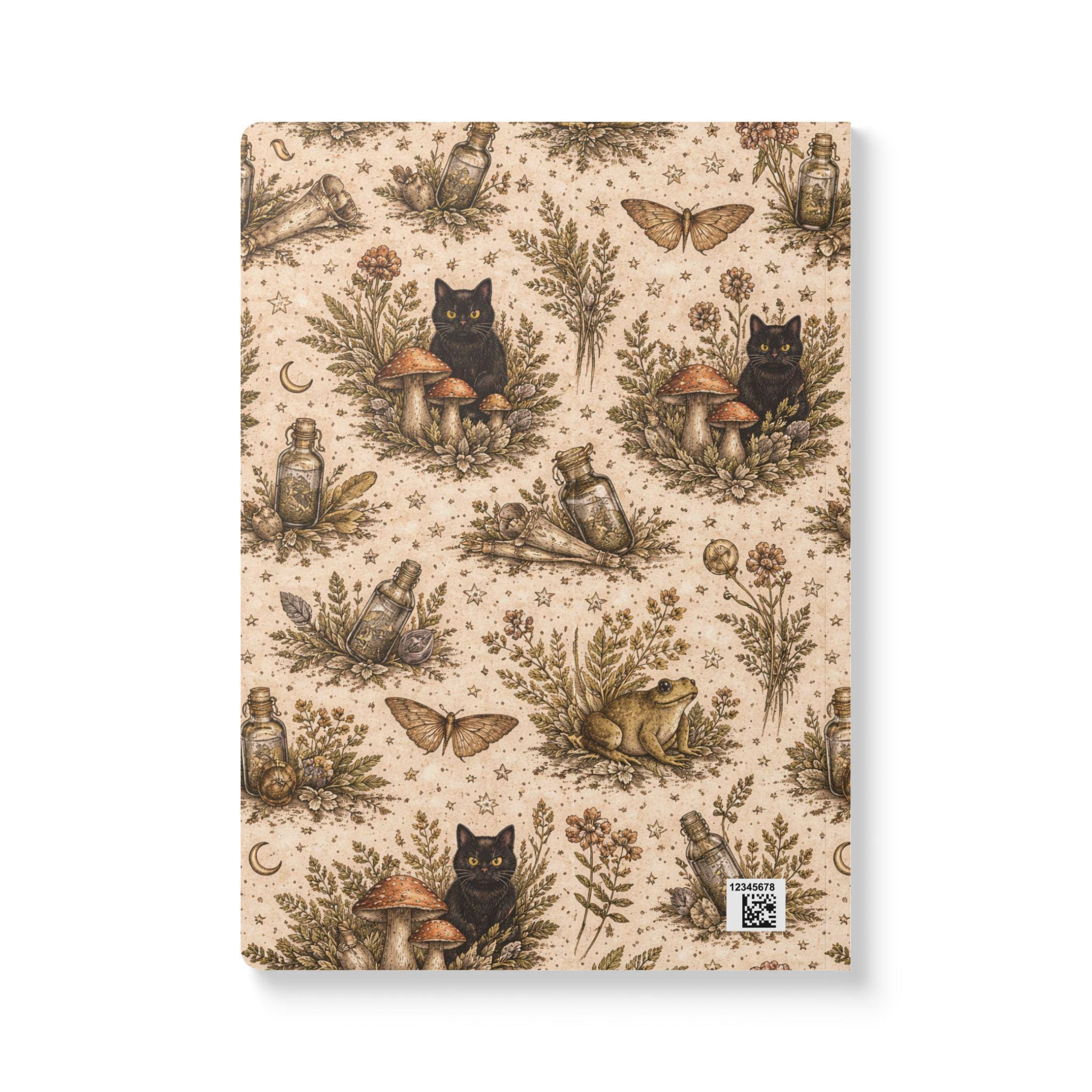 A softcover journal wrapped in a warm, witchy botanical pattern—tiny moons, moths, jars, mushrooms, and a curious black cat nestle among dried herbs. The satin-finish cover feels smooth in hand and the rounded corners keep it cozy in a bag. Inside, creamy 80lb (120gsm) paper takes ink and pencil with a pleasing weight; choose 100 pages (50 sheets) or 200 pages (100 sheets) depending on how many spells, sketches, or lists you keep. Perforated sheets let you tear out pages cleanly for sharing or framing. Three customizable inner sheets give room for a name, a ritual list, or a personalized page. Assembled in the USA from globally sourced parts, this journal blends practical quality with a quiet, rustic magic that invites daily use and small private rituals.