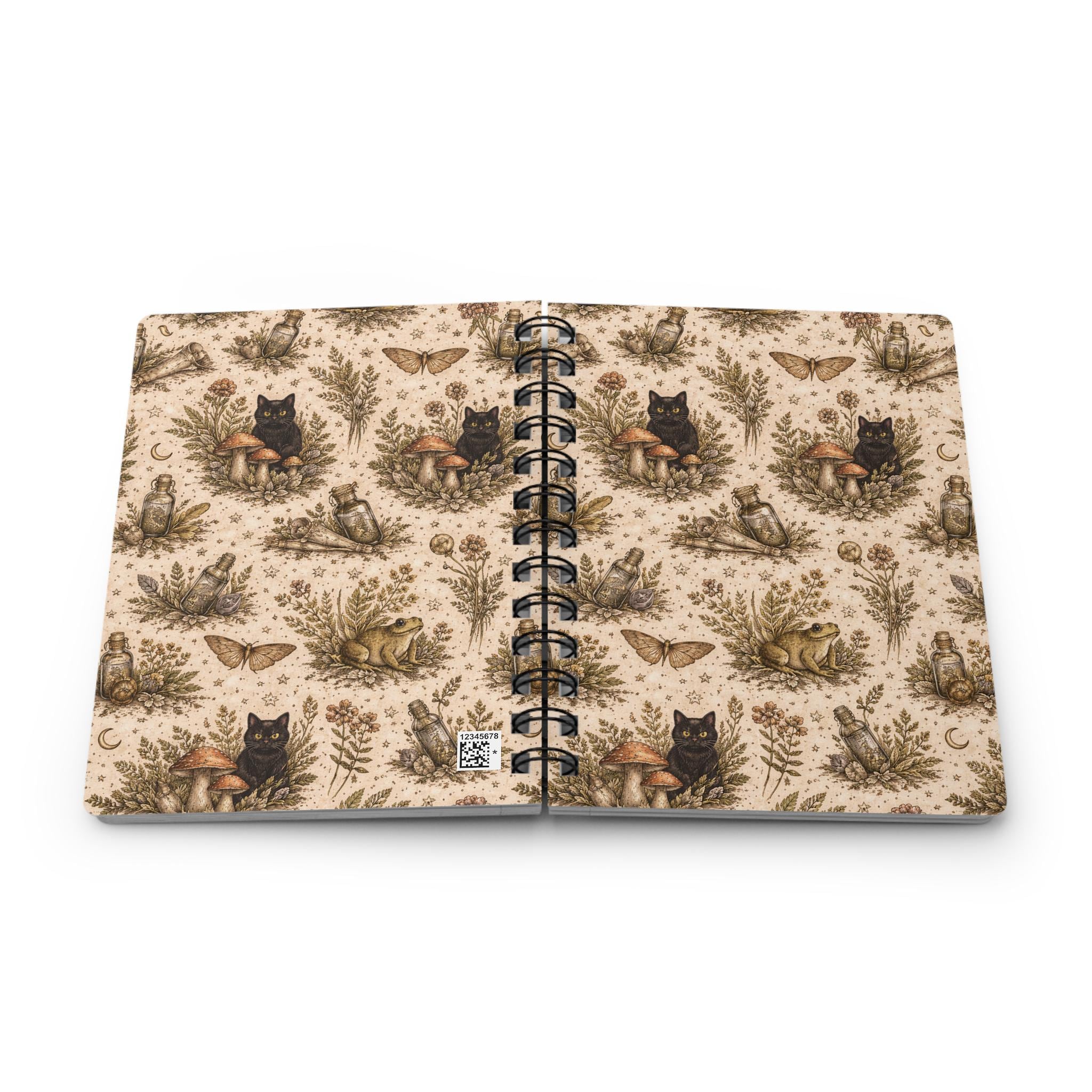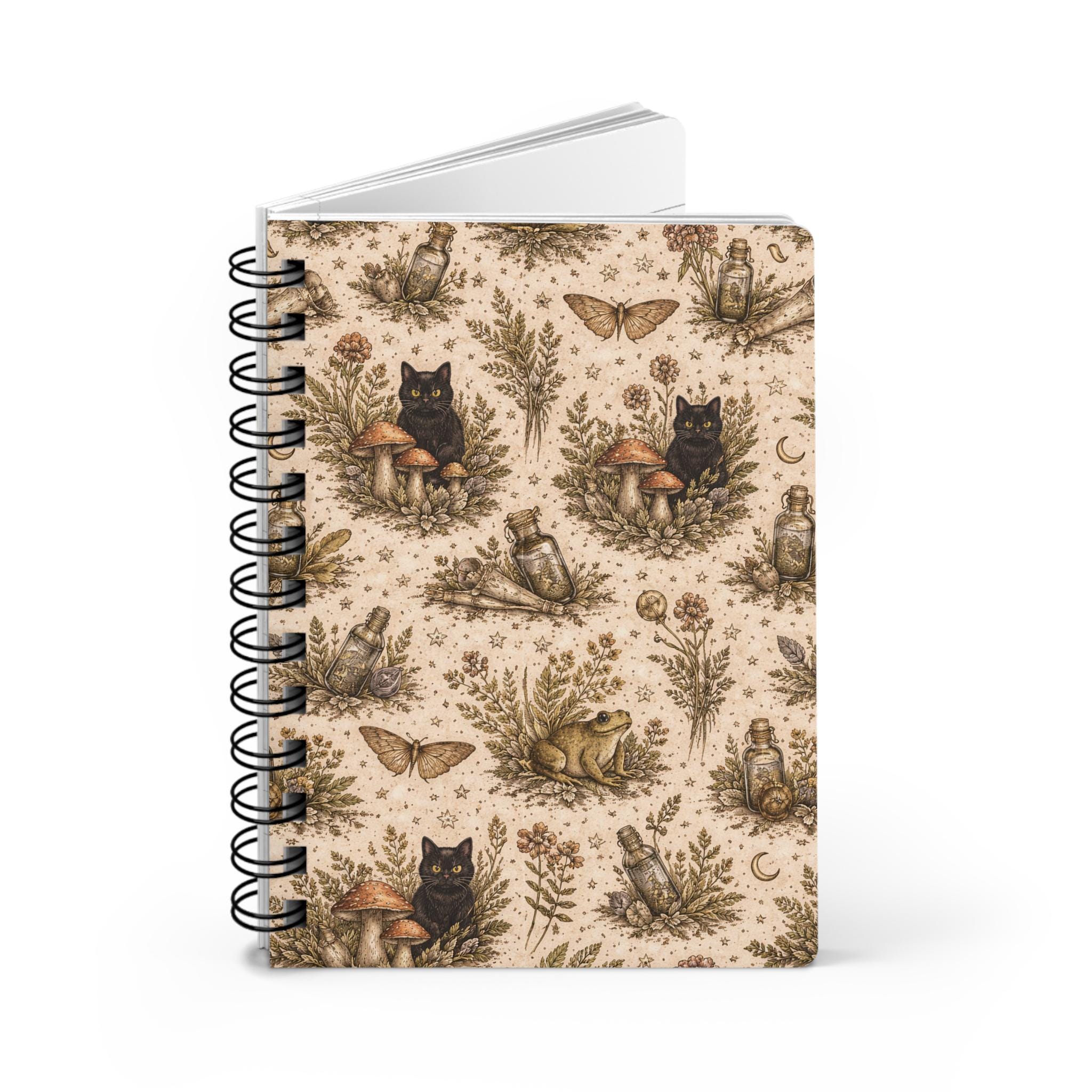 This spiral-bound journal brings a quiet, woodland magic to everyday notes. The glossy laminated cover shows an enchanted pattern of black cats, curled foxes, wild mushrooms, and delicate botanicals in warm, vintage tones. Inside, 150 lined pages on sturdy 90gsm paper invite longhand lists, sketch-notes, and stream-of-consciousness entries. The metal spiral lets pages lie flat or be removed cleanly, while full-wrap printing (front, back and inside cover) keeps the design immersive. Carry it to coffee shop journaling sessions, tuck it into a tote for market days, or keep it on your bedside table for moonlit thoughts.