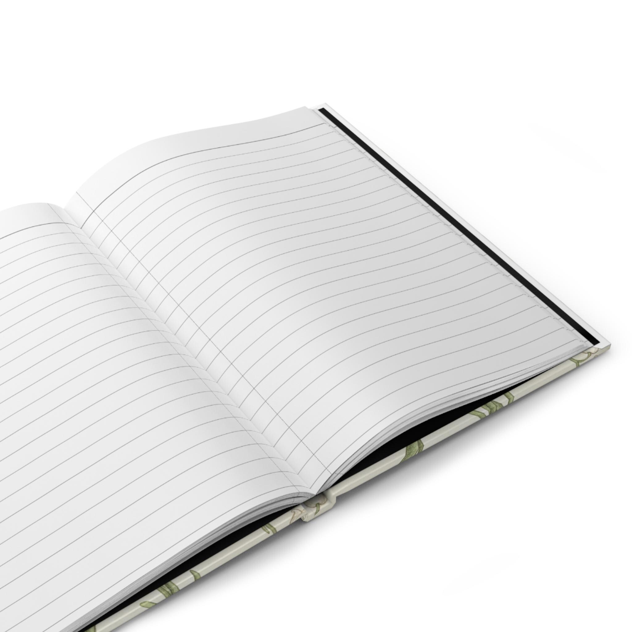 This hardcover journal wraps delicate botanical art in a soft matte finish that invites you to slow down and write. Gentle sprays of lily-of-the-valley bloom across the cover in muted greens and cream tones, giving the book a quiet, vintage feel. Inside, 150 lined pages sit on a sewn casewrap binding that opens flat and bends easily as you write. Pages are perforated for clean removal when you want to share a note or tuck a sketch into a folder. Bright, faithful printing keeps each leaf and petal crisp across the full wraparound design. Small production details, like the subtle barcode on the back, are discreet and won’t distract from the cover’s calm design.