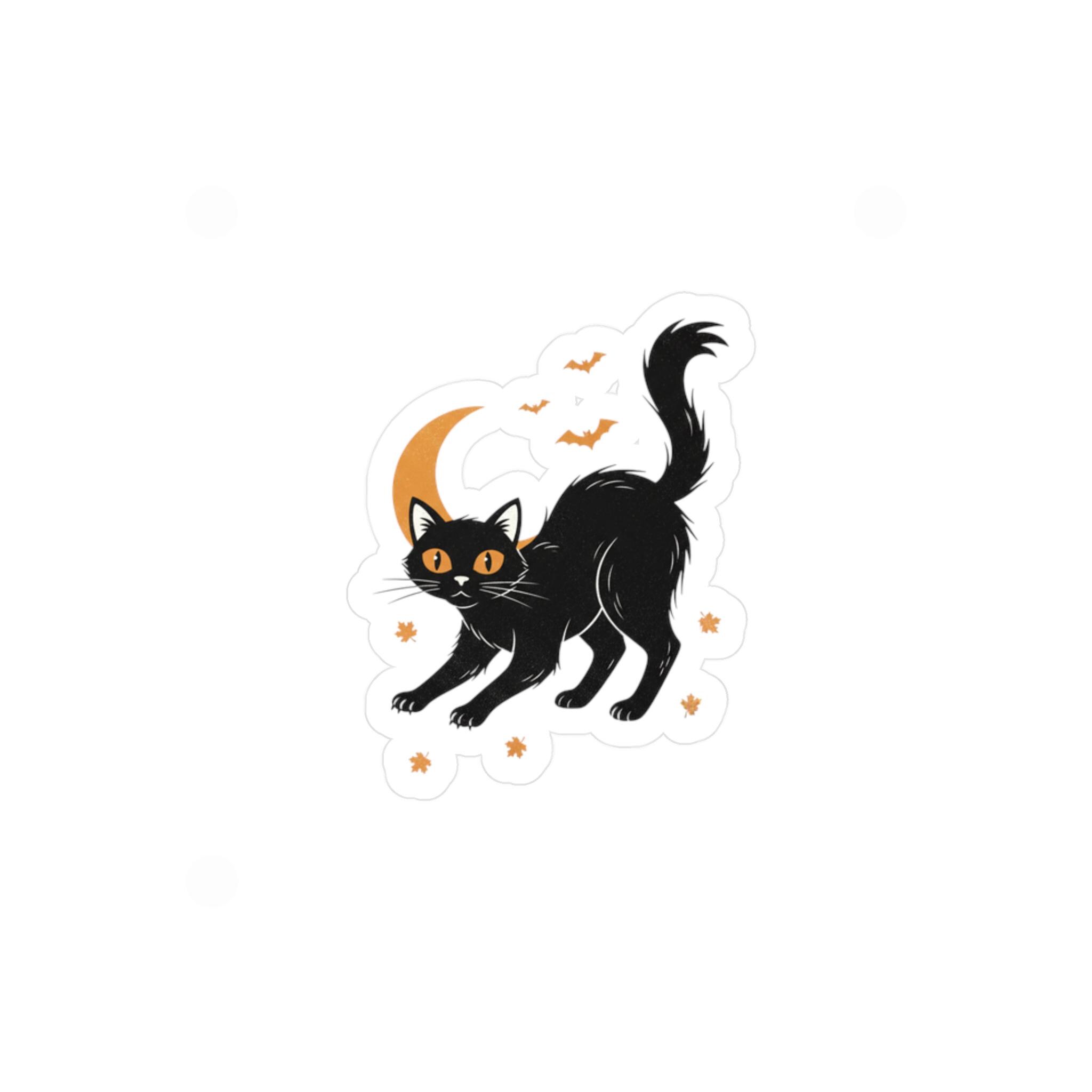 Small moments of mischief and moonlight—this satin-finish vinyl decal captures a wide-eyed black cat mid-stretch, crescent moon and tiny bats tucked into the composition. The subtle 1/8" white kiss-cut border and removable adhesive make it effortless to place on journals, laptop lids, windows, or water bottles. Colors stay bright outdoors thanks to UV, water, and scratch resistance, while the satin surface gives the artwork a soft, slightly muted sheen that complements autumn and spooky-season aesthetics. It feels like a secret sticker you’d tuck into your planner or press onto a café window to send a playful, witchy vibe to anyone walking by.