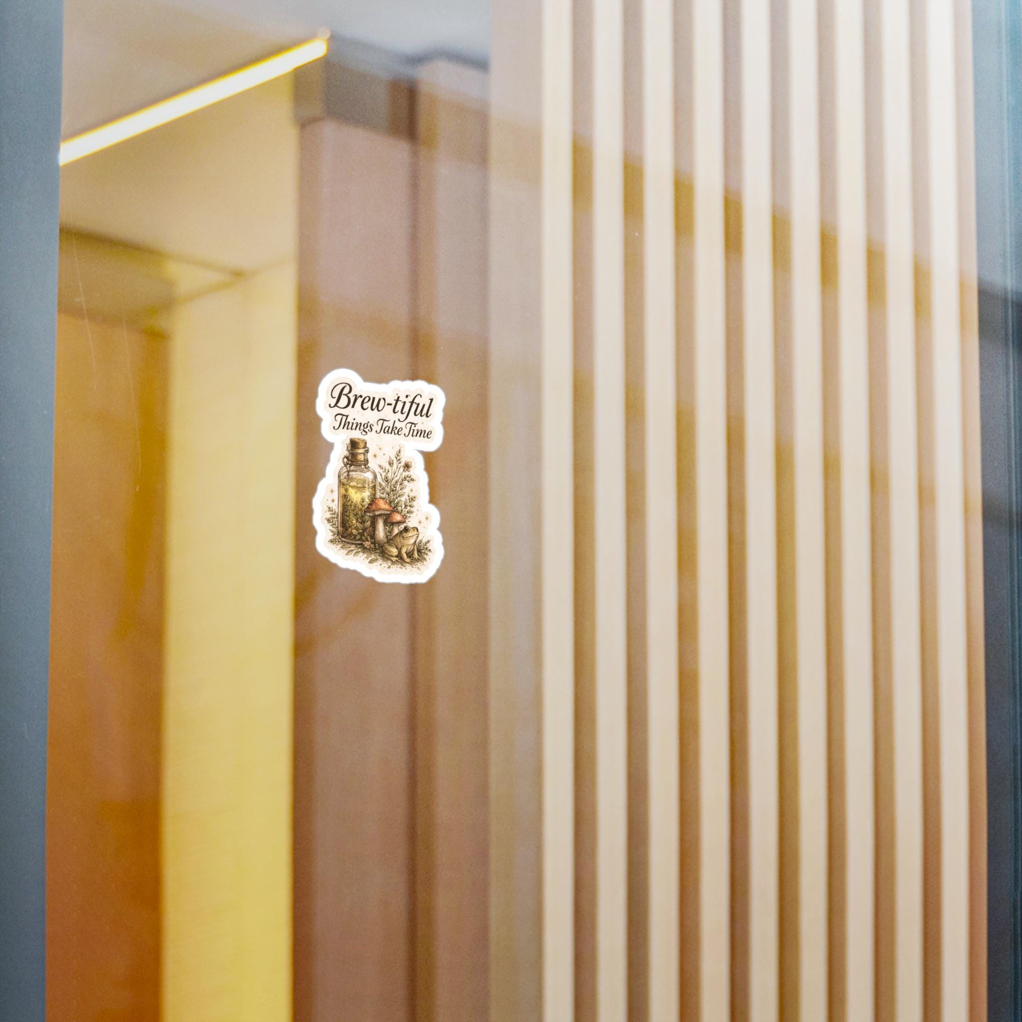 A charming kiss-cut vinyl decal that brings a warm, botanical vibe wherever it goes. The design features a vintage-style apothecary bottle, mushrooms, sprigs of herbs, and the hand-lettered phrase “Brew-tiful — Things Take Time.” The muted, earthy palette and satin finish give it an antique, illustrated feel that complements wood, glass, and metal surfaces. It clings with a removable adhesive so you can refresh your laptop, water bottle, journal, or window without residue. Weather-resistant and built to keep its color outdoors for up to three years, this decal ages like a well-loved sketch — quietly beautiful and full of small details that invite a second look.