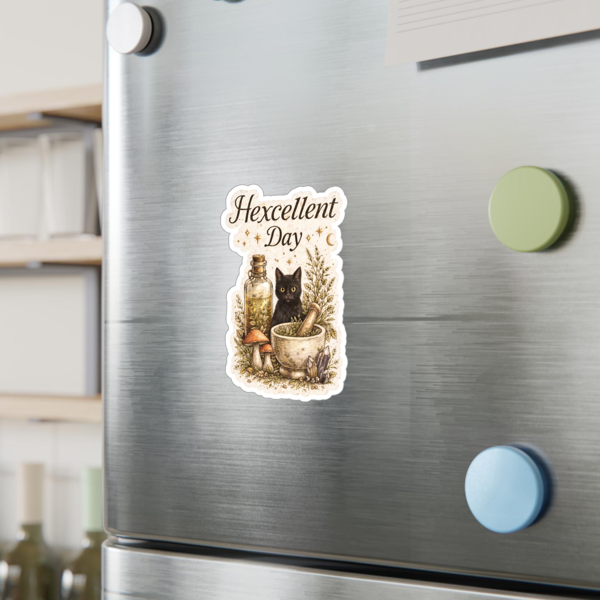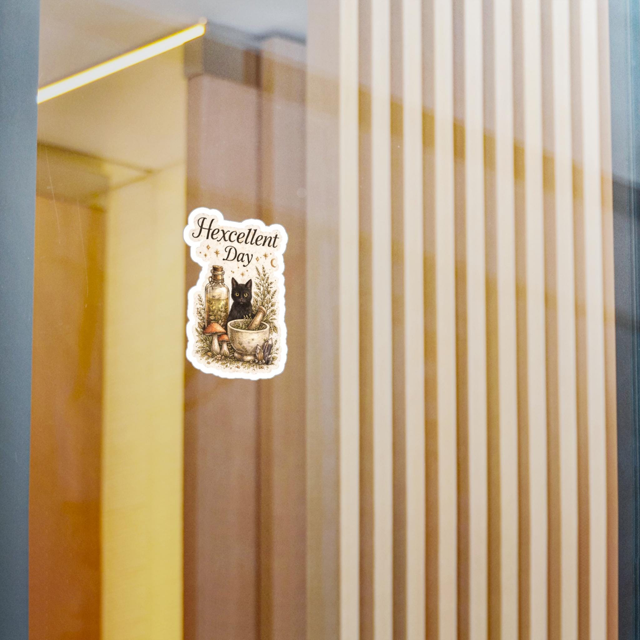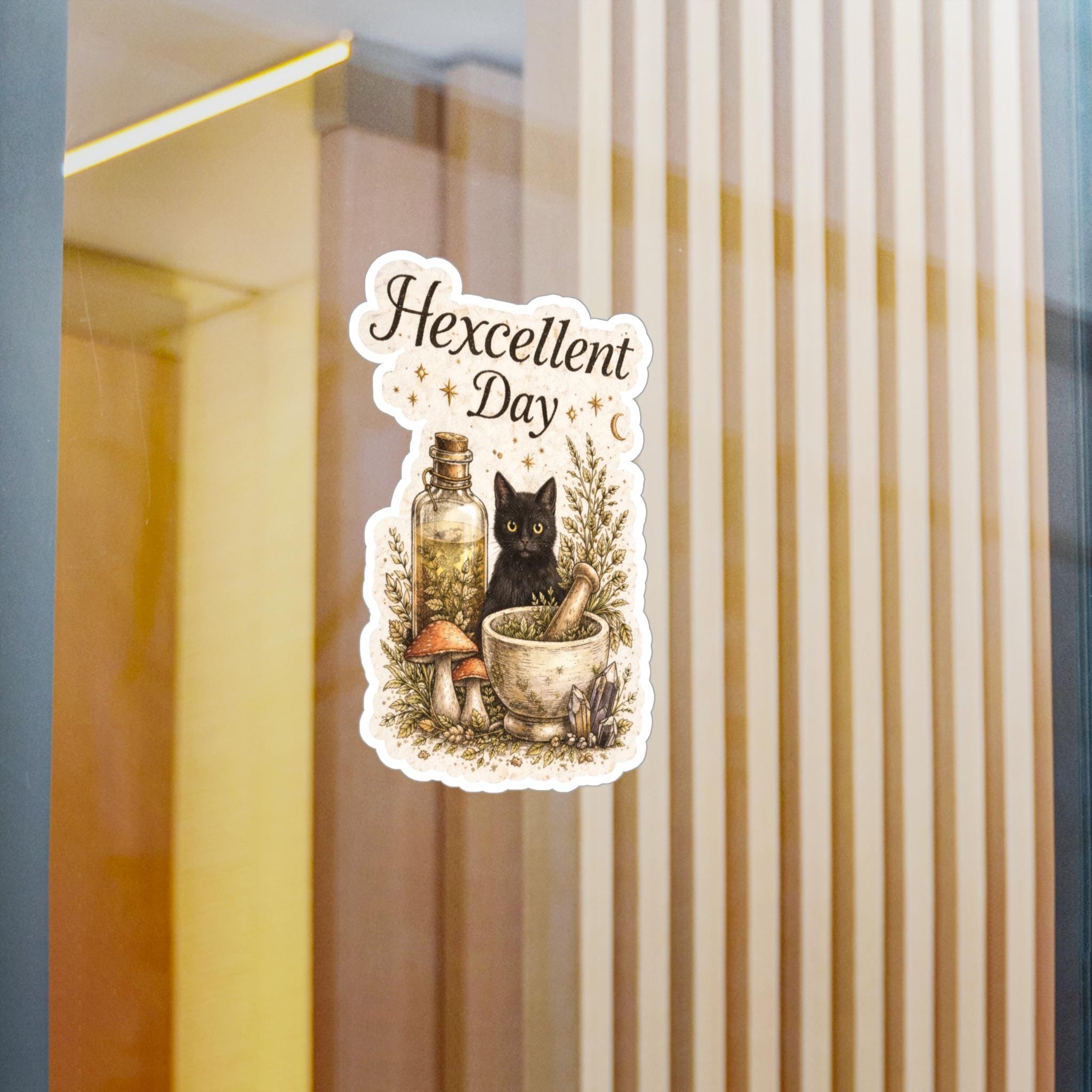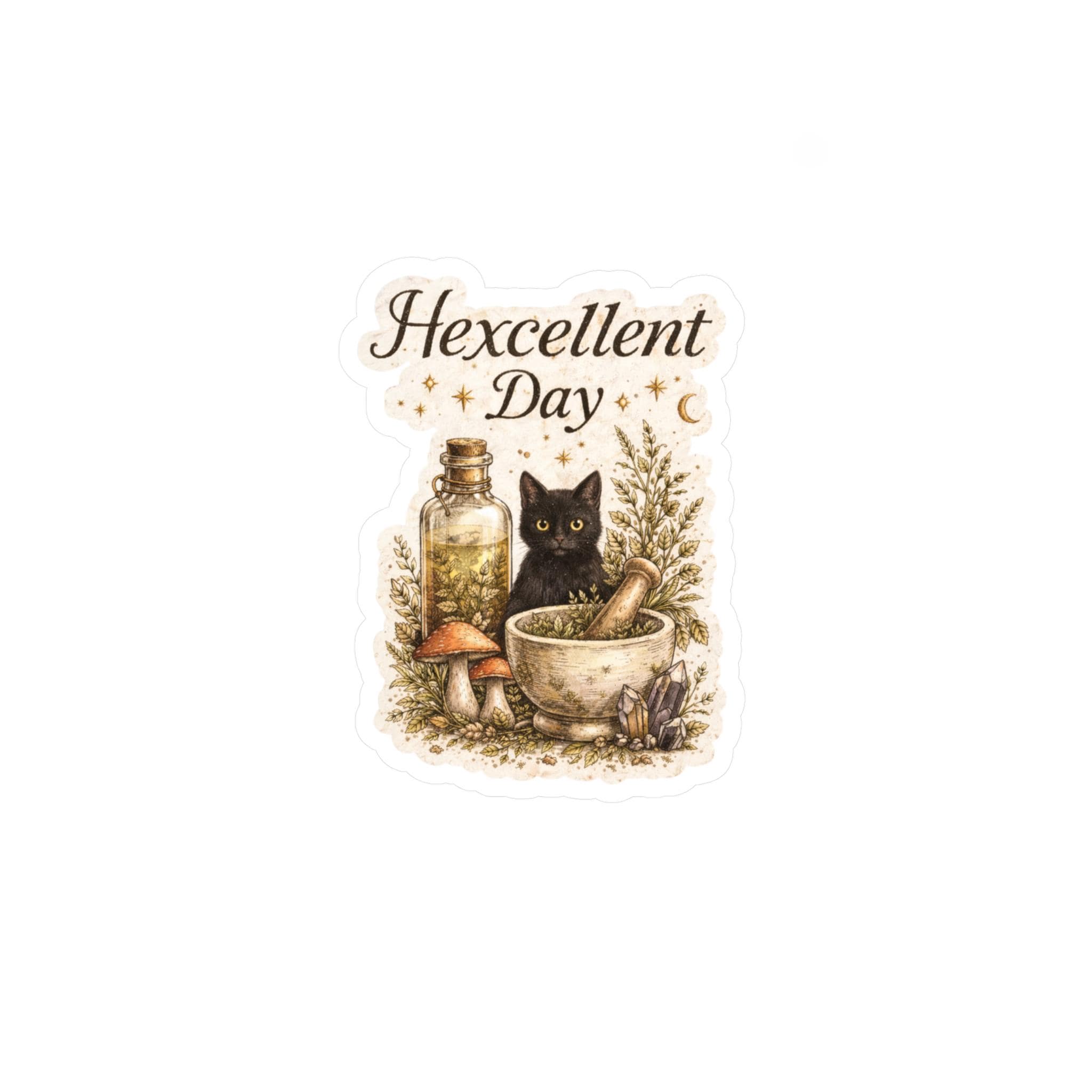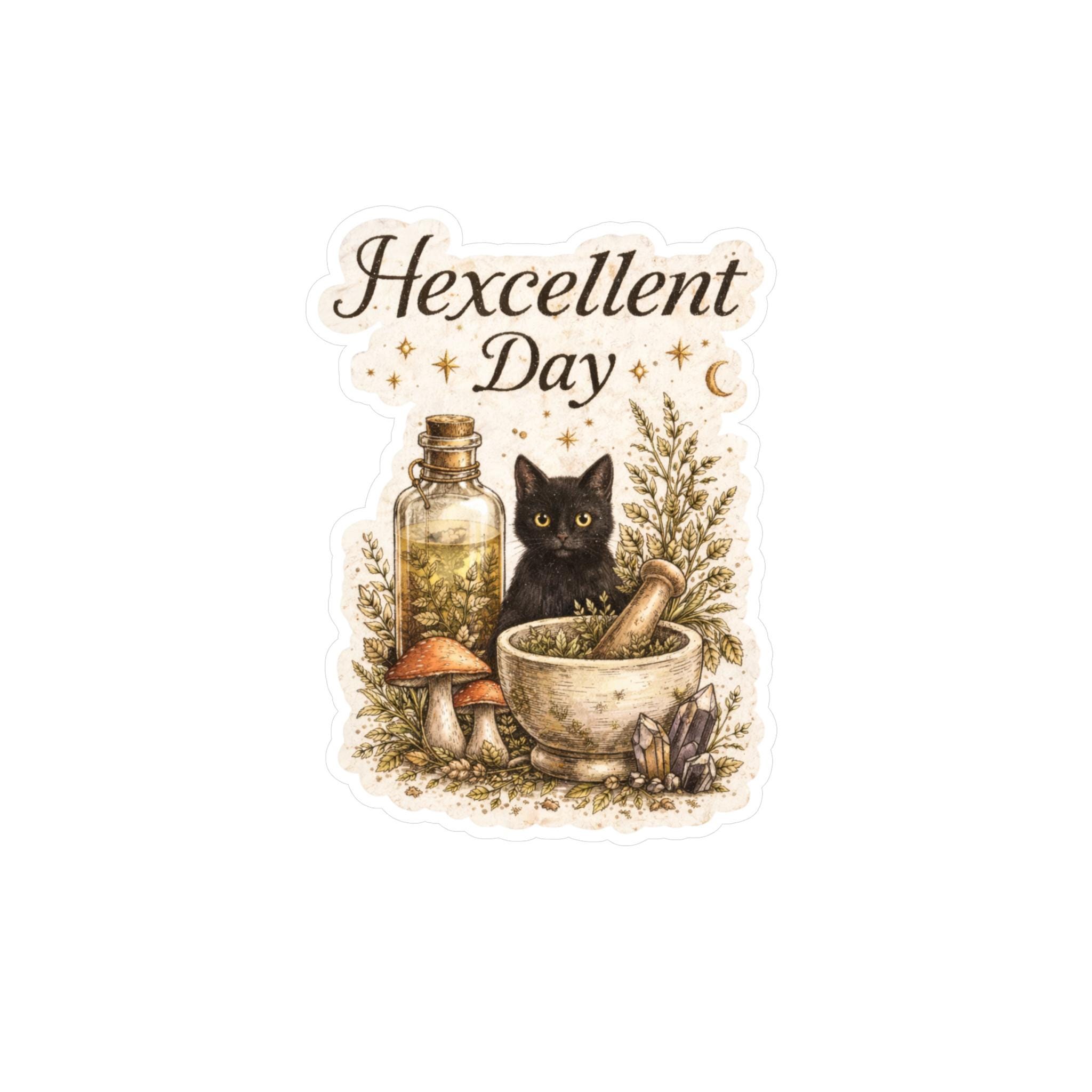 Small rituals, quiet magic, and a wink from a curious black cat — this satin-finish kiss-cut vinyl decal brings a cozy, witchy charm to water bottles, laptops, windows, or your favorite journal. Soft sepia tones and crisp detail capture a mortar and pestle, apothecary bottle, mushrooms, and leafy sprigs beneath the hand-lettered phrase “Hexcellent Day.” The removable adhesive lets you reposition or swap it out without sticky residue, while the durable satin vinyl stands up to sun, rain, and scratches so your little talisman keeps looking aged and warm for seasons to come. Subtle white border framing the art makes it easy to peel and apply, and four size options let you choose how bold you want the spell to be.