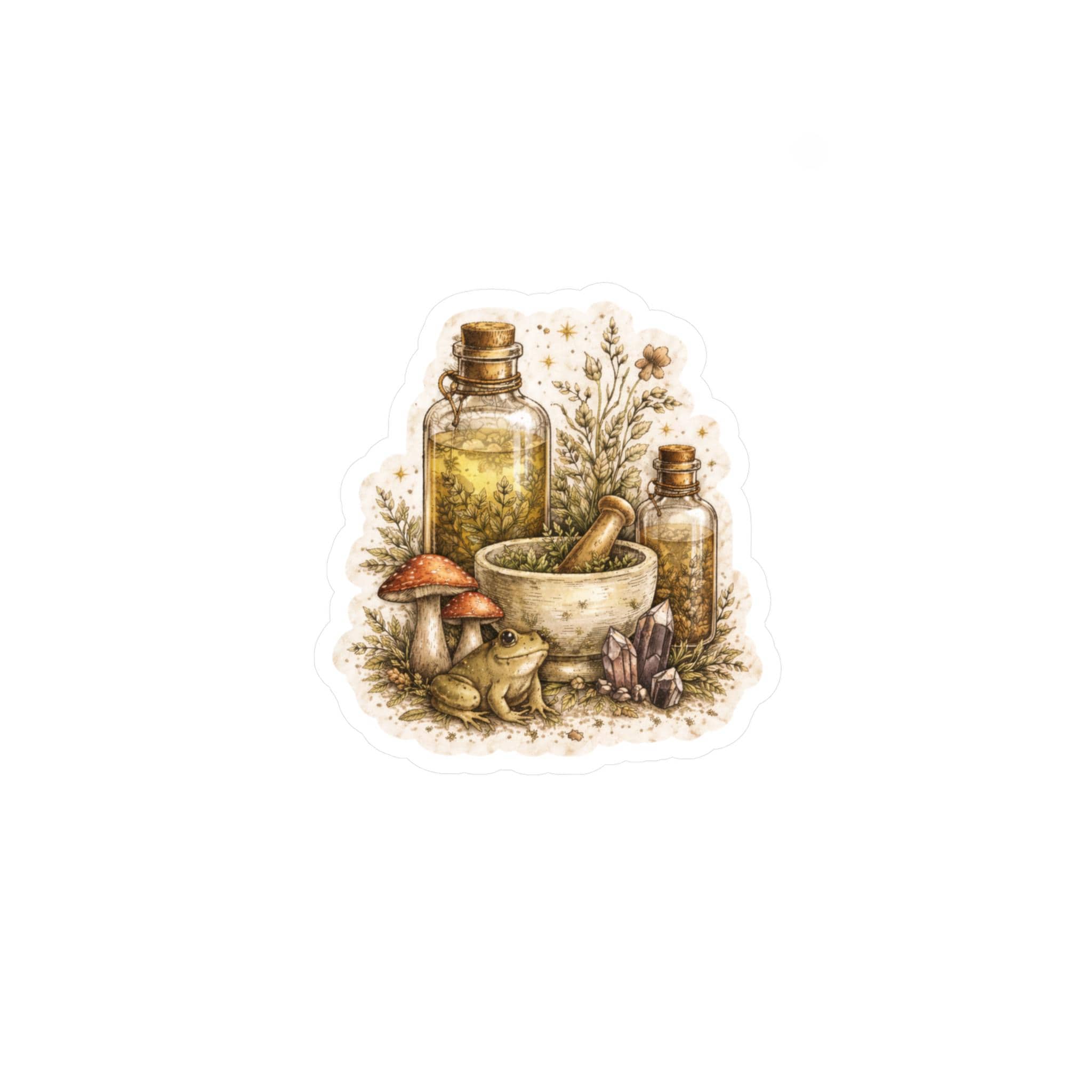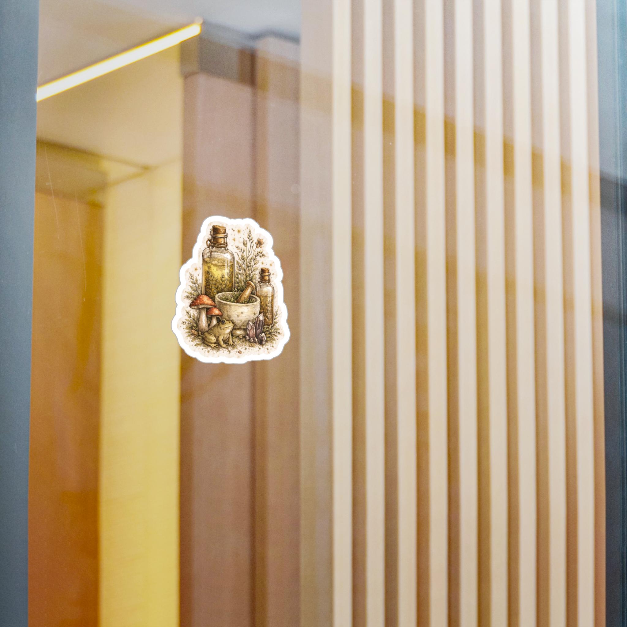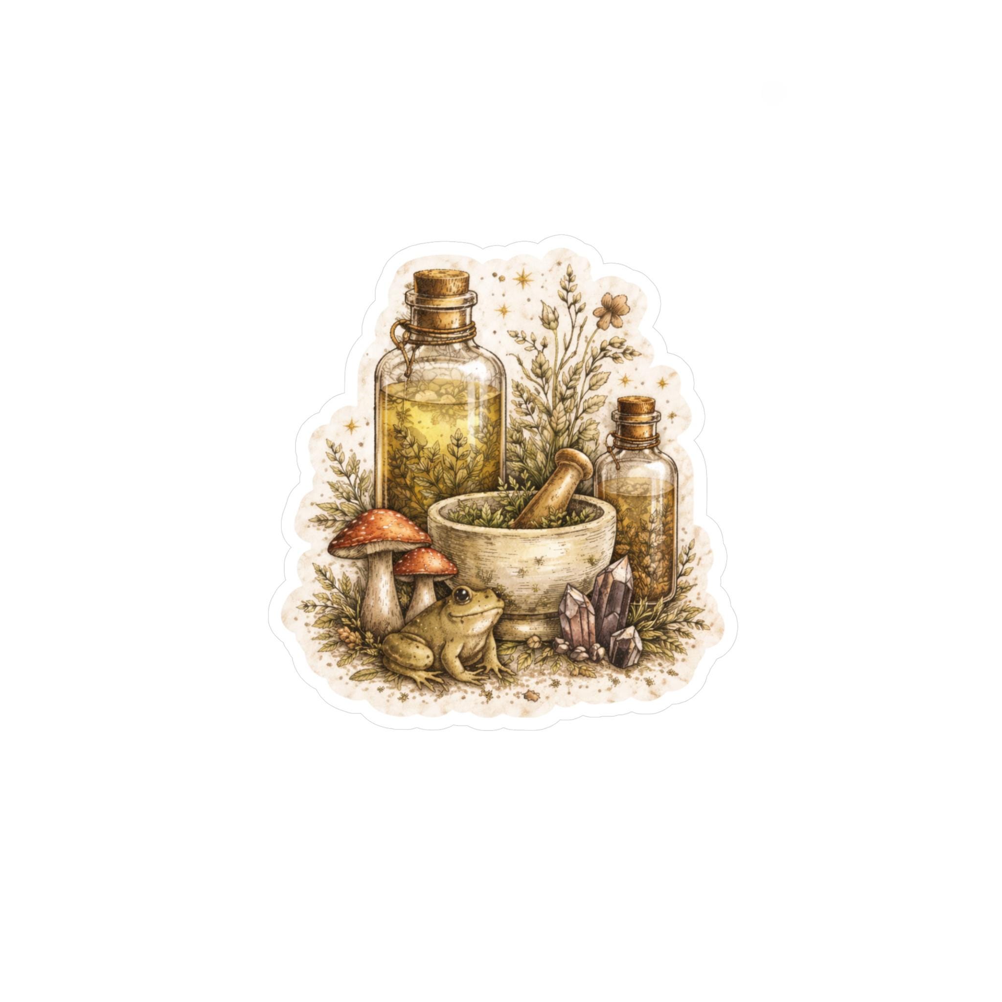 Tiny herbal apothecary captured on satin vinyl — this kiss-cut decal shows a mortar and pestle, glass apothecary bottles, mushrooms and wild herbs in warm, earthy tones. It clings cleanly to windows, water bottles, laptops or sketchbooks and keeps its soft sheen outdoors. Let it speak for your slow-craft rituals: a quiet reminder of foraging walks, kitchen experiments, and the small, careful moments that turn herbs into remedies and stories.