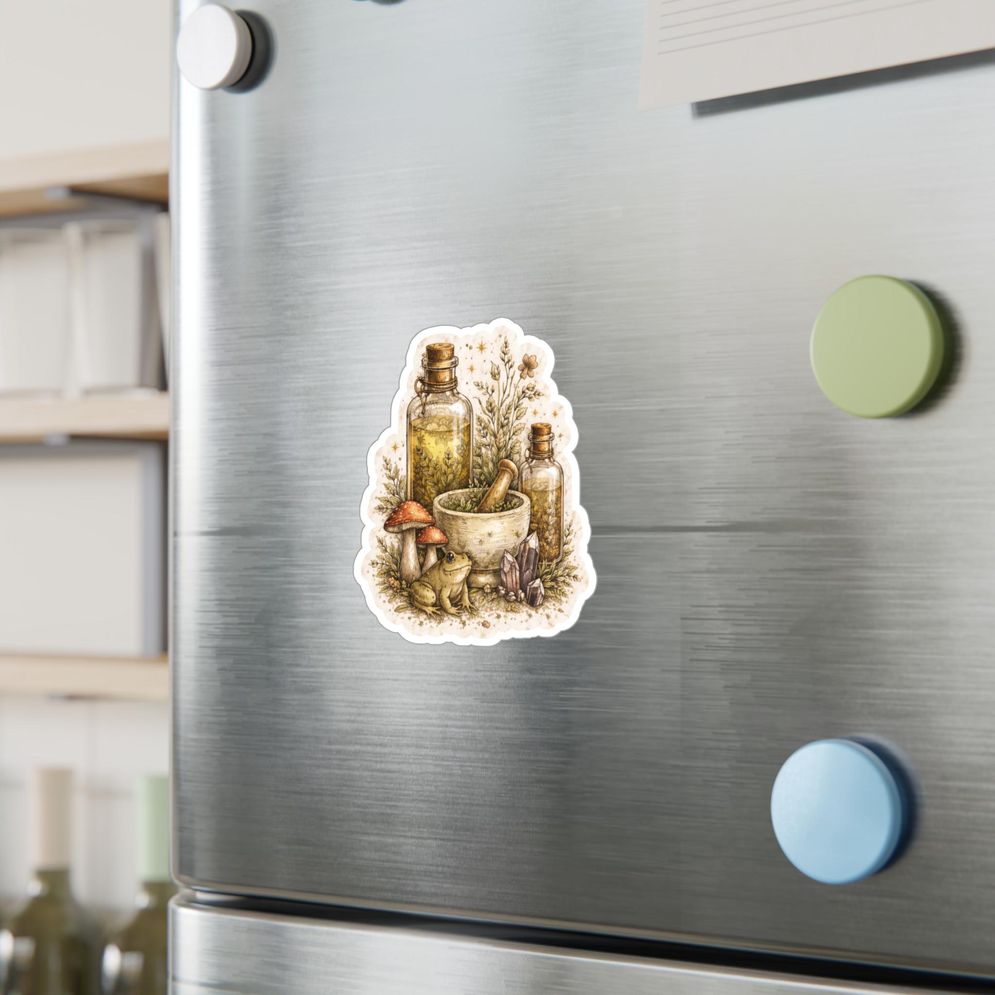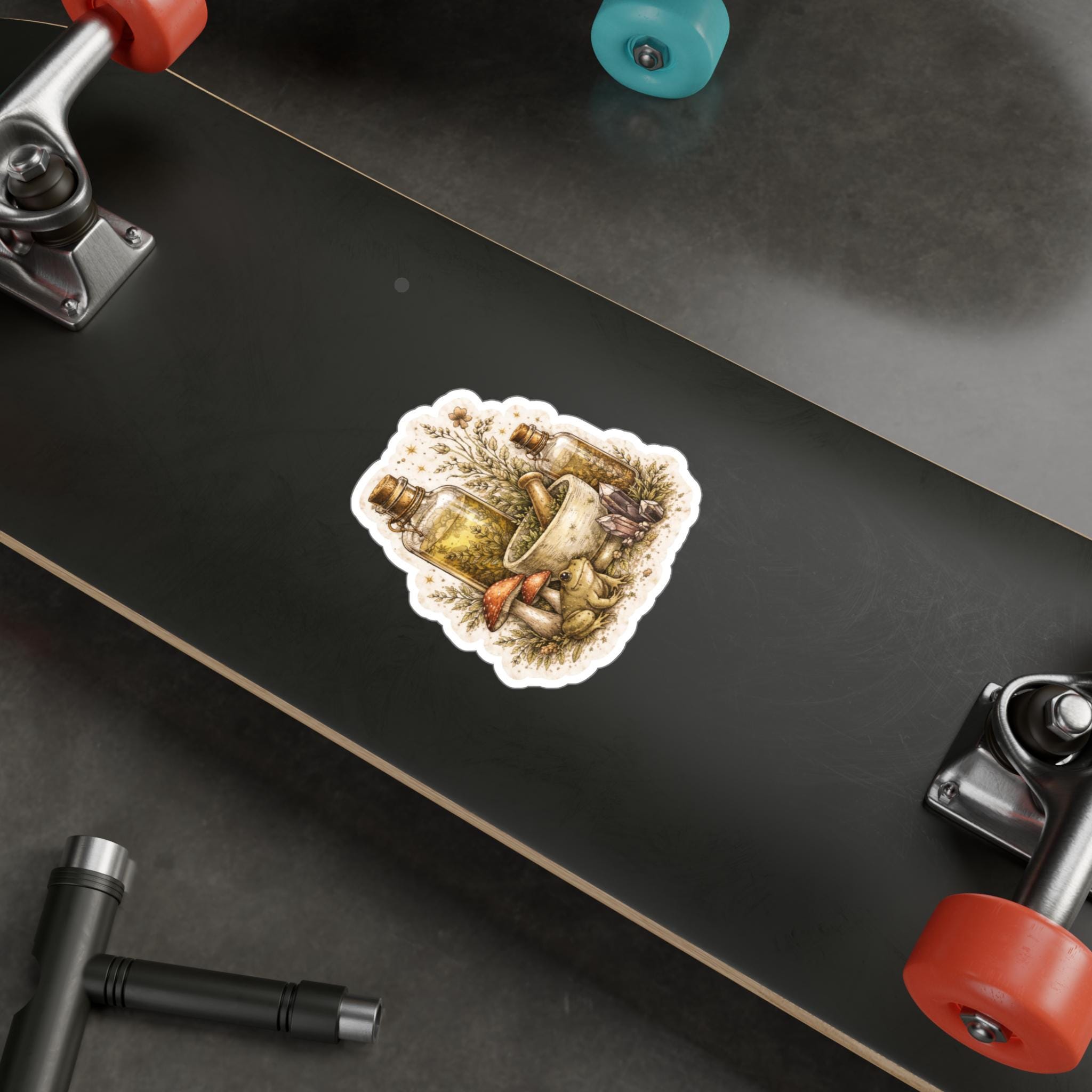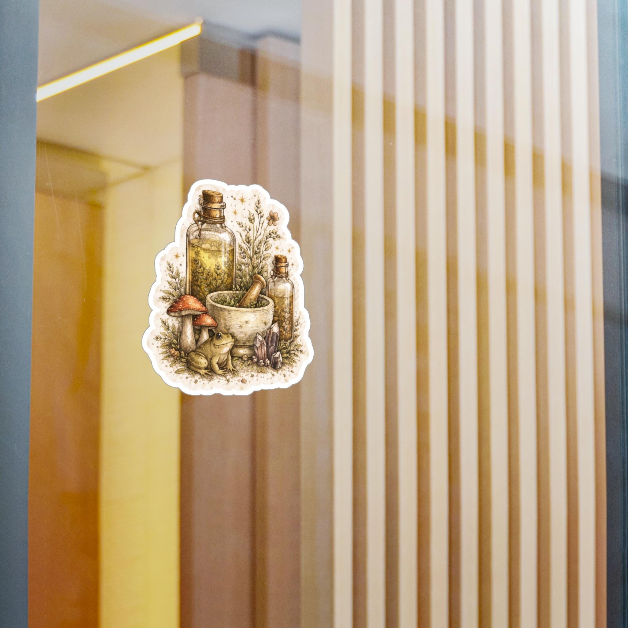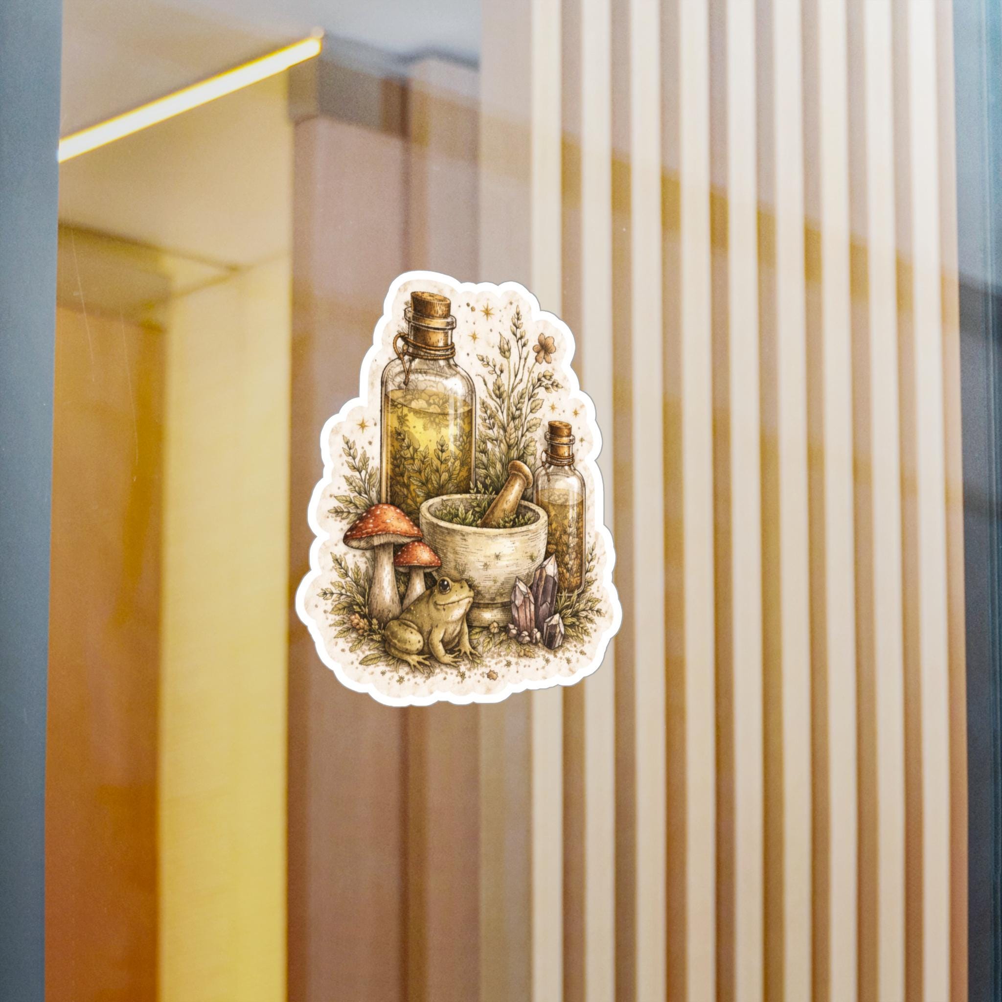 Tiny herbal apothecary captured on satin vinyl — this kiss-cut decal shows a mortar and pestle, glass apothecary bottles, mushrooms and wild herbs in warm, earthy tones. It clings cleanly to windows, water bottles, laptops or sketchbooks and keeps its soft sheen outdoors. Let it speak for your slow-craft rituals: a quiet reminder of foraging walks, kitchen experiments, and the small, careful moments that turn herbs into remedies and stories.