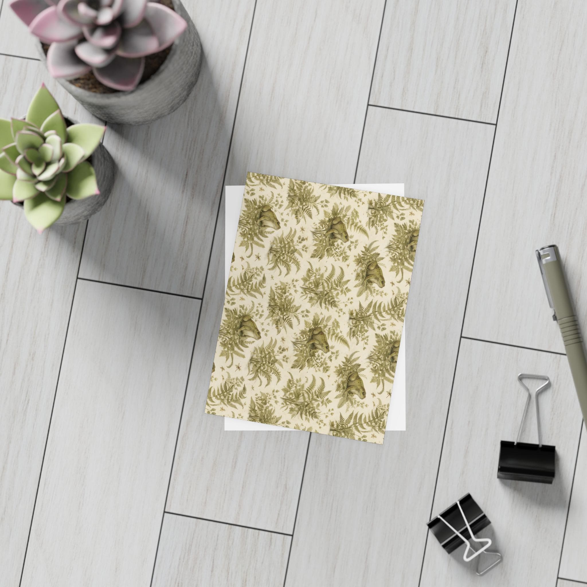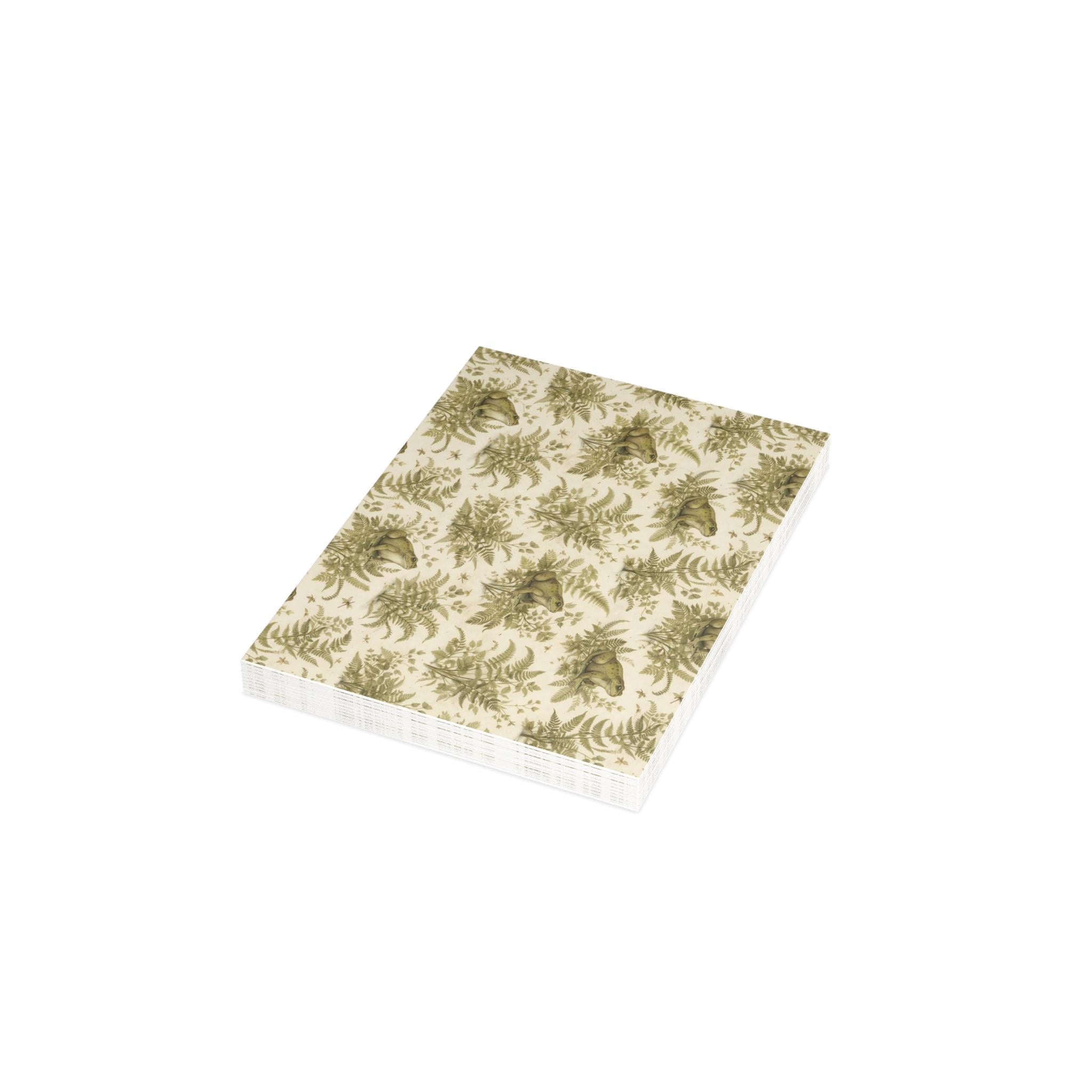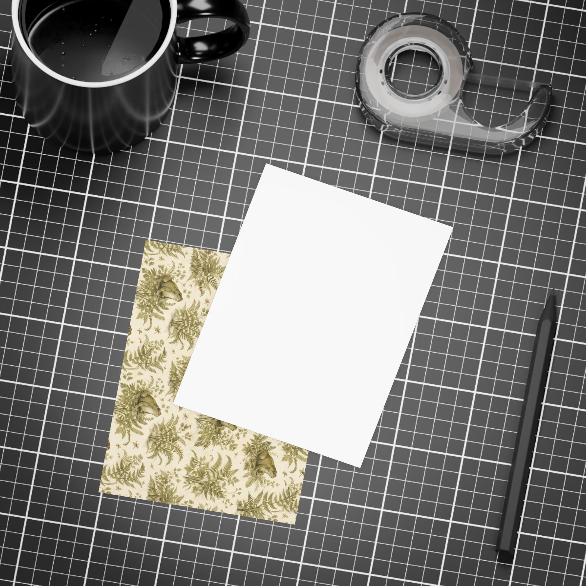 A set of artful postcards featuring a charming frog and fern illustration that brings a touch of woodland whimsy to notes and snail-mail. Each card carries vivid, museum-quality color that makes the tiny details of the frog’s skin and the fern’s fronds pop. Choose the paper finish that matches your message — from silky coated to textured uncoated or smooth matte — and pick the orientation and size that best suits your note. Envelopes are included, so these bundles are ready to tuck into pockets, slip into a mailer, or stack on a desk for spontaneous correspondence. The design evokes quiet pond-side mornings, damp earth, and the hush of ferns unfurling — a small, tactile way to share that atmosphere with friends, pen pals, or fellow nature lovers.