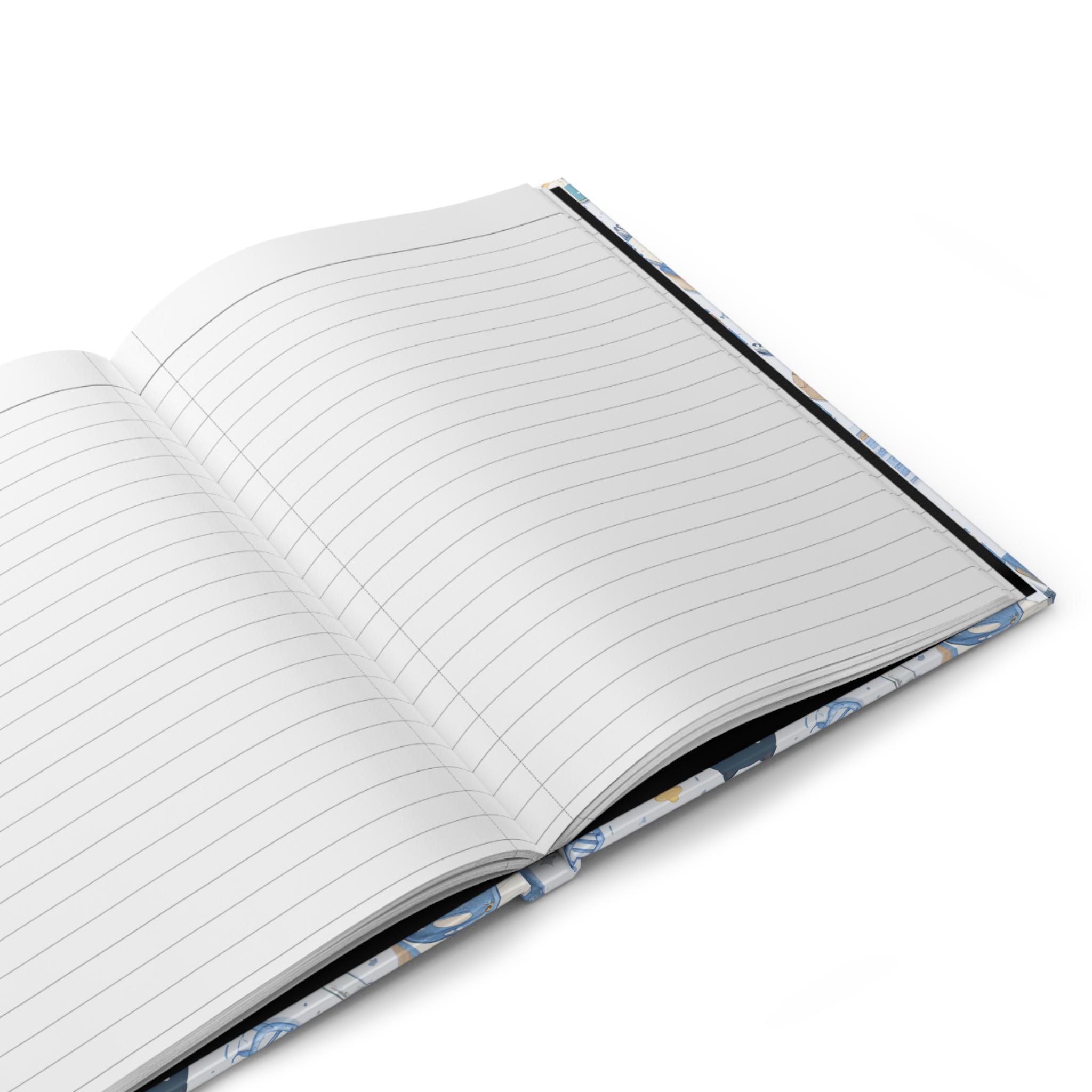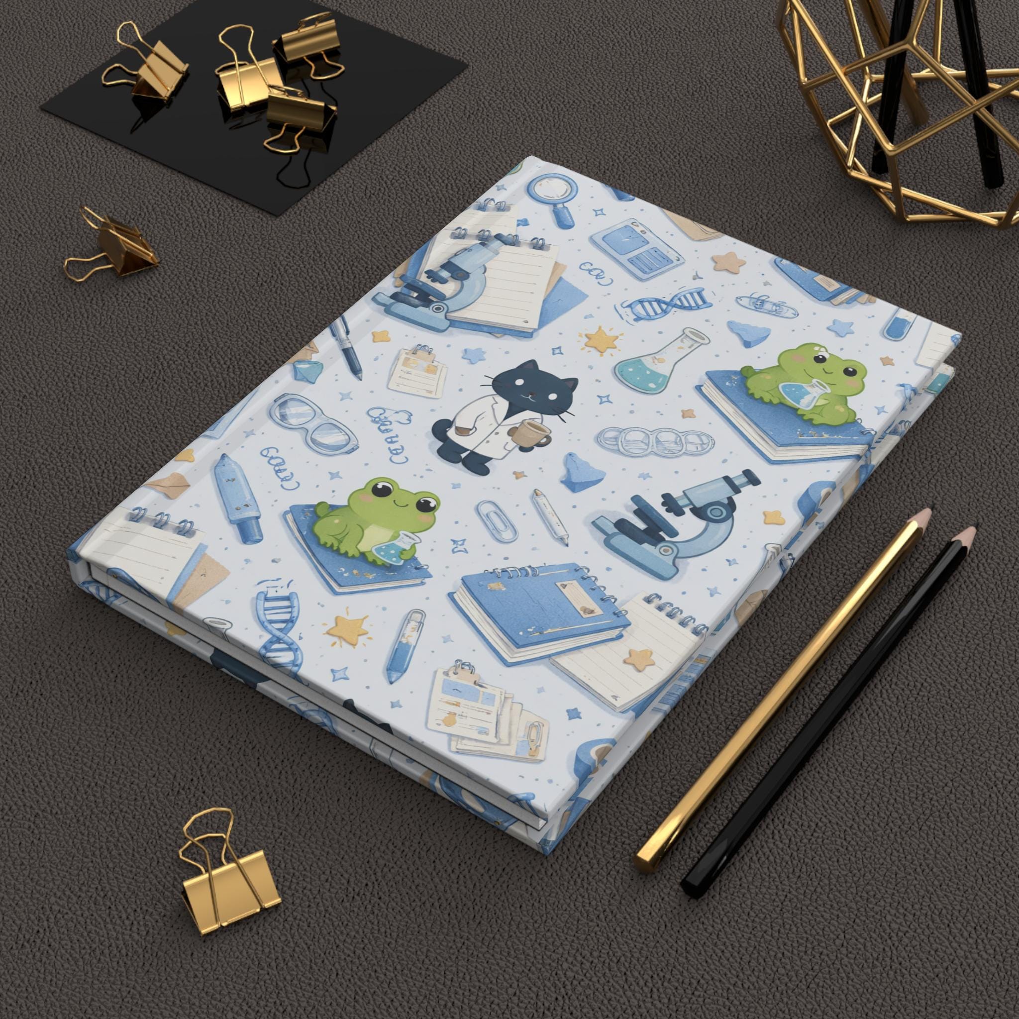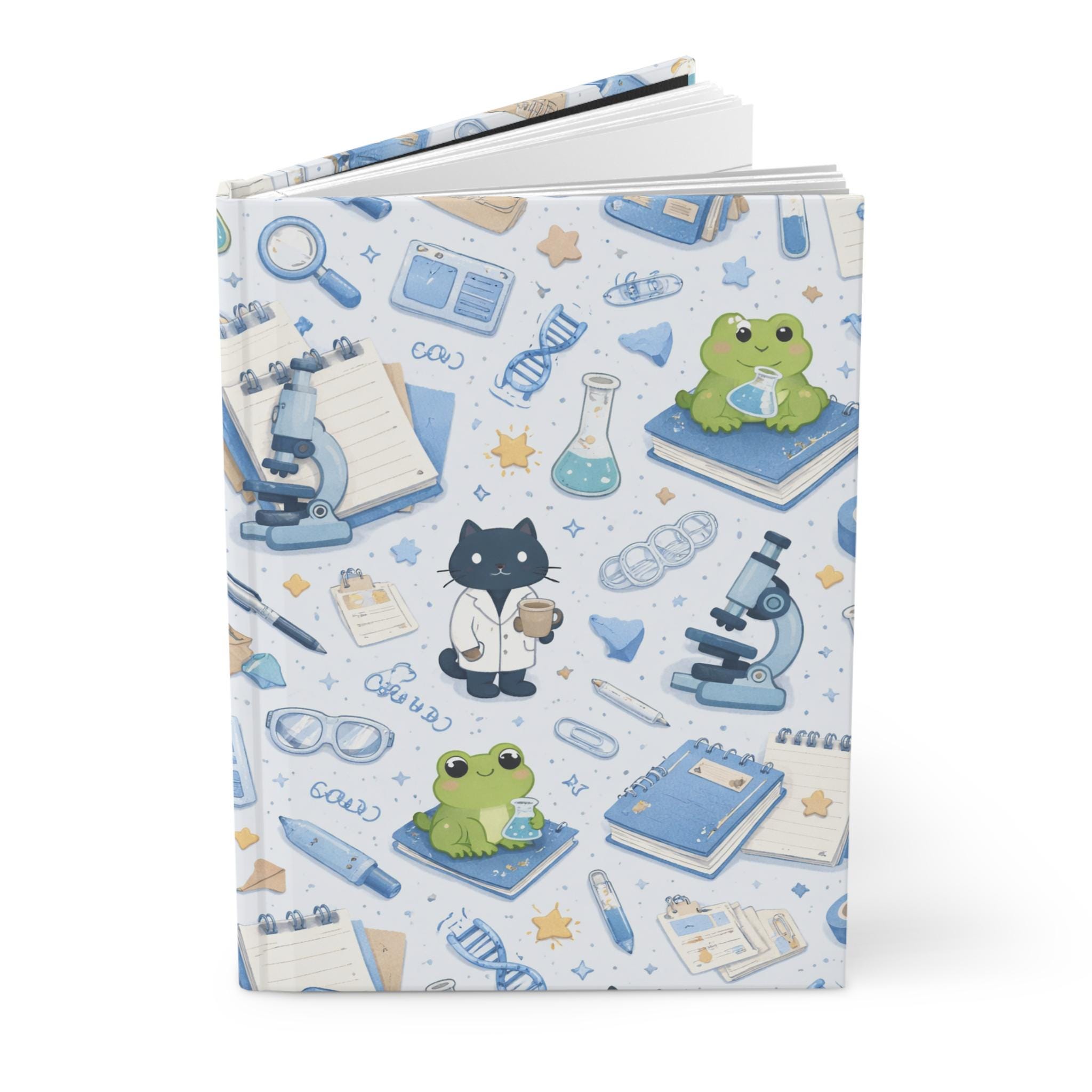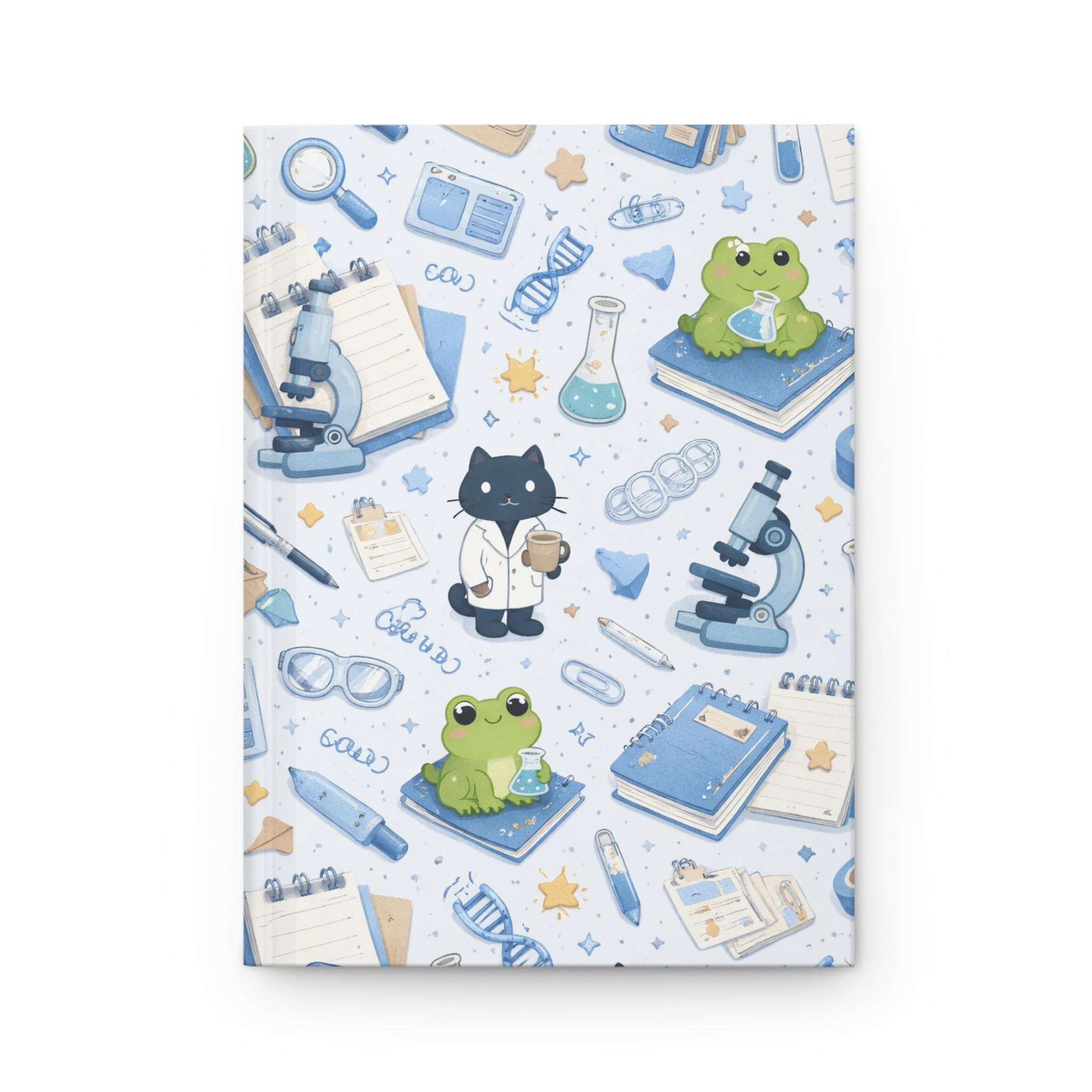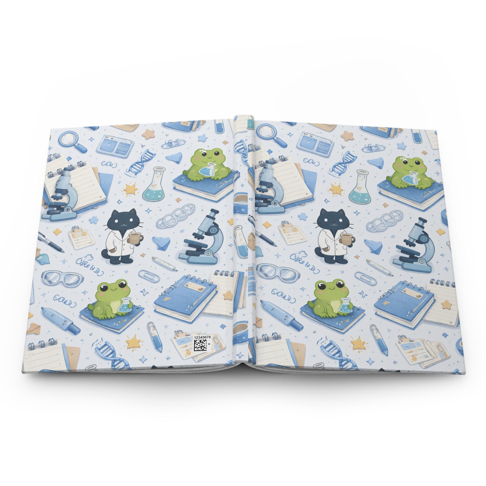 This hardcover journal brings a gentle, whimsical science theme to everyday note-taking. The matte laminated cover shows a repeating pattern of microscopes, flasks, DNA strands, notebooks, and two charming characters—a lab-coat-wearing cat and a bright green frog—scattered across a soft blue-and-cream backdrop. The sewn casewrap binding keeps the book flexible and durable, while 150 lined pages with perforations let ideas be captured, revised, and shared. Carry it to classes, lab meetings, or cozy study sessions; it feels light in the hands and steady on the desk, inviting sketches, observations, and little experiments of the mind.