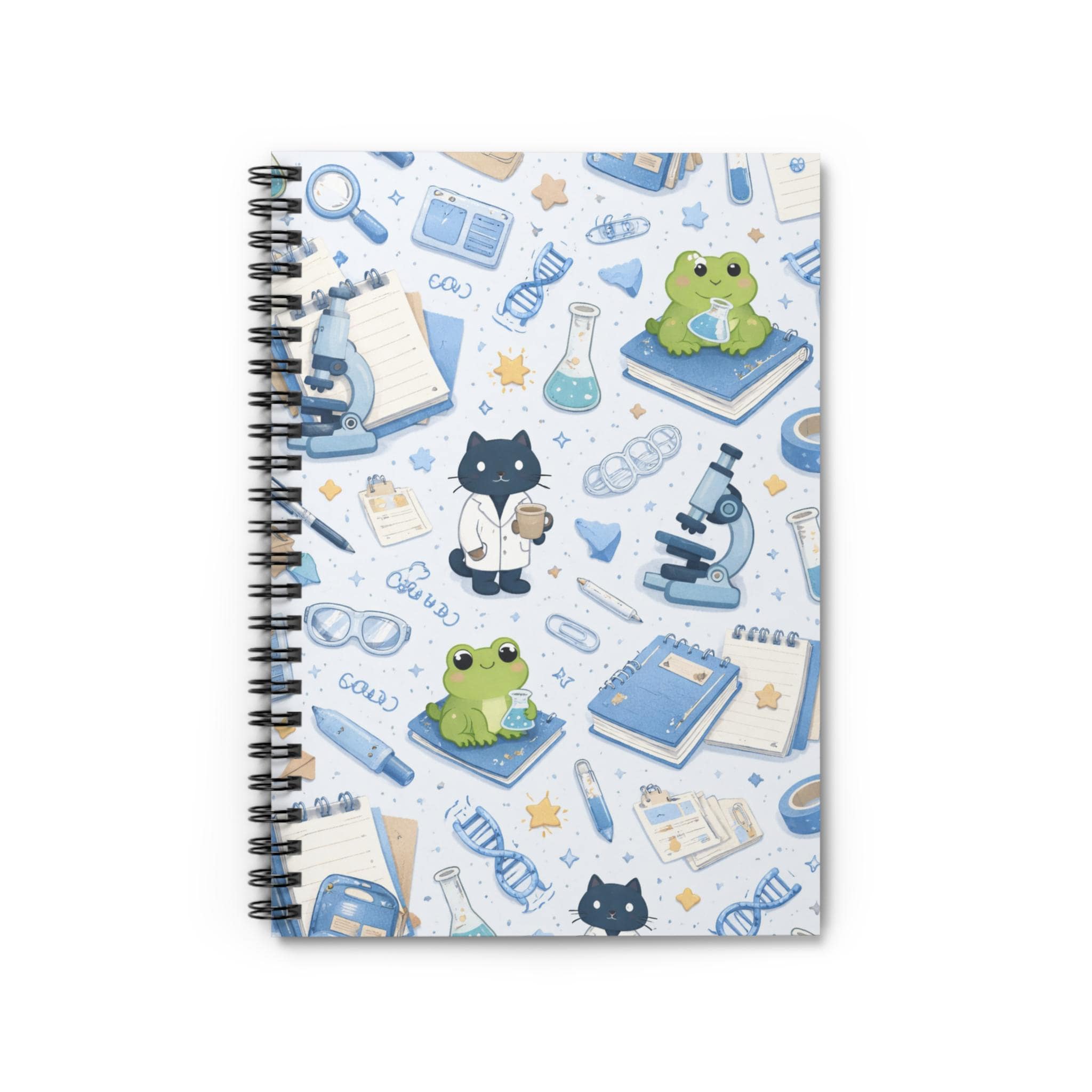 A cheerful spiral notebook made for jotting, sketching, and keeping small lab ideas alive. The cover features playful science-themed characters — a bespectacled cat in a lab coat and a bright green frog perched on a stack of books — surrounded by microscopes, flasks, DNA strands, and notebooks in a soft blue palette. At 6 x 8 inches it slips into backpacks or tote bags easily. Inside, 118 ruled pages on smooth 90gsm paper make notes glide across the page while a metal spiral lets the notebook lie flat or fold back for single-handed writing. An interior document pocket keeps loose papers, receipts, or lab slips organized. The compact size and durable 350gsm covers mean it stands up to daily use whether you’re sketching field observations, drafting study notes, or logging creative experiments.