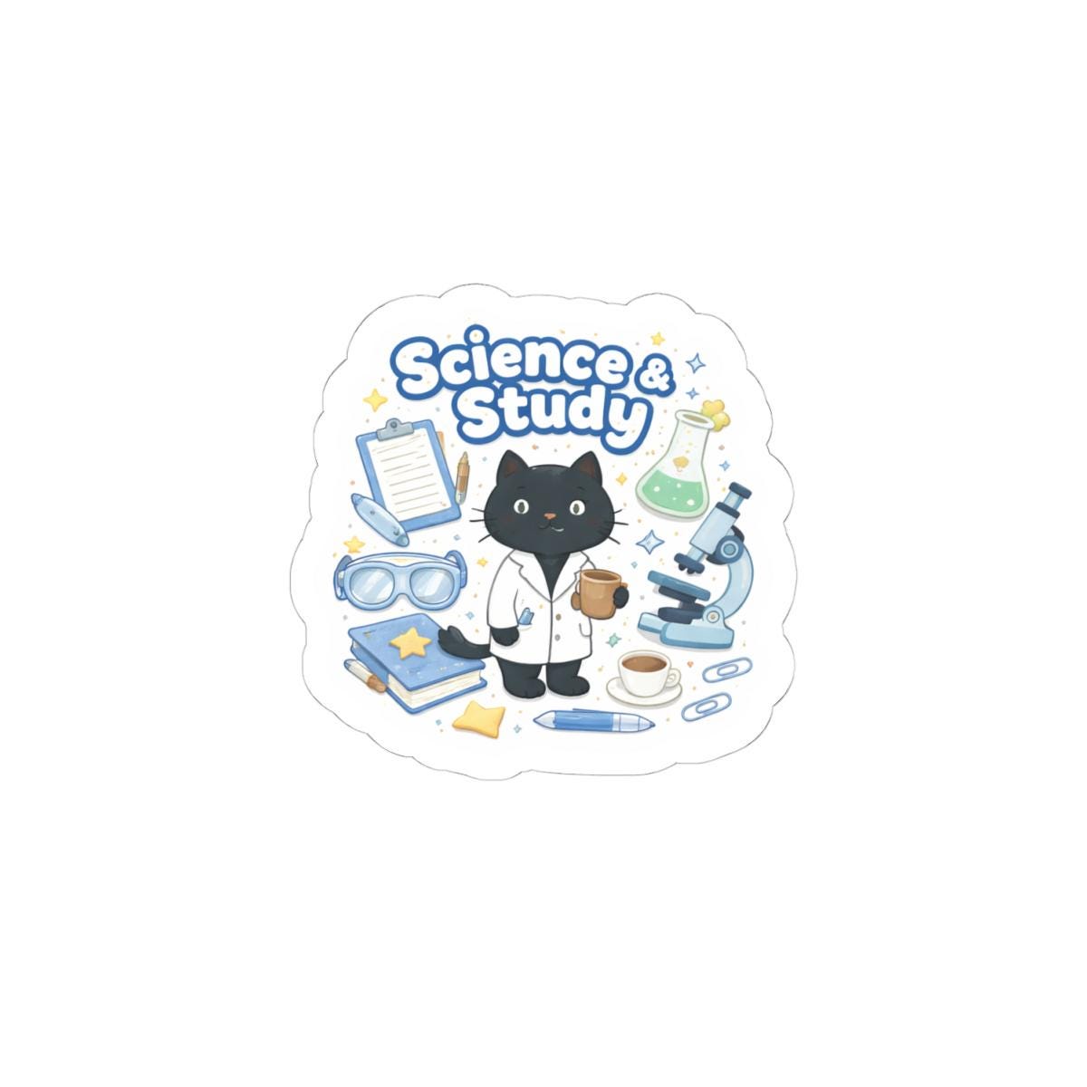 Tiny lab vibes with a soft, playful touch. This glossy kiss-cut sticker shows a wide-eyed black cat in a lab coat surrounded by microscopes, beakers, notebooks and tiny stars — a quiet celebration of curiosity and late-night study sessions. It clings smoothly to laptops, journals, water-resistant cases and more, adding a cheerful study-buddy to your everyday gear. The design blends pastel blues and warm neutrals to stay subtle yet uplifting, making it easy to tuck into a planner or use as a motivation nudge on a study desk.