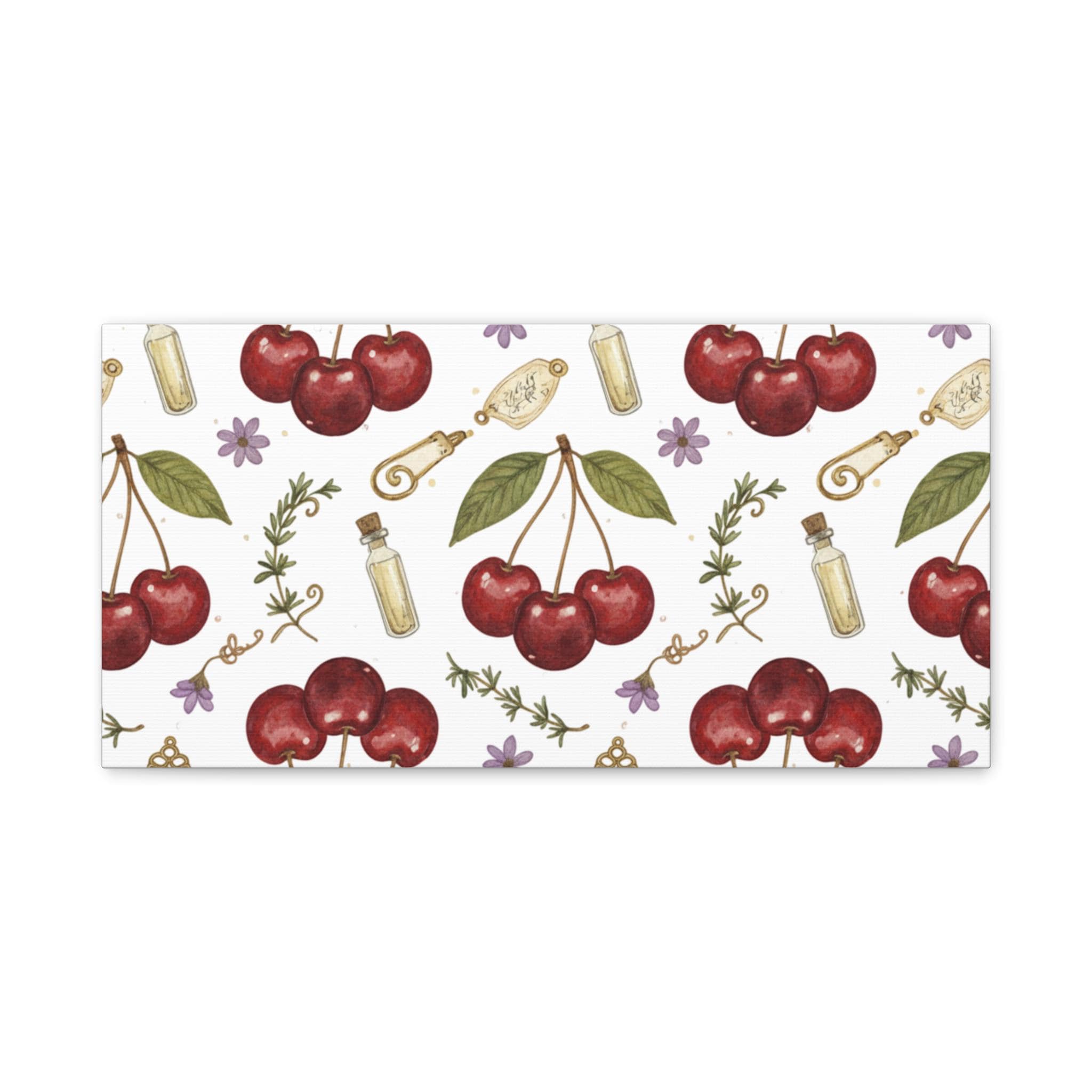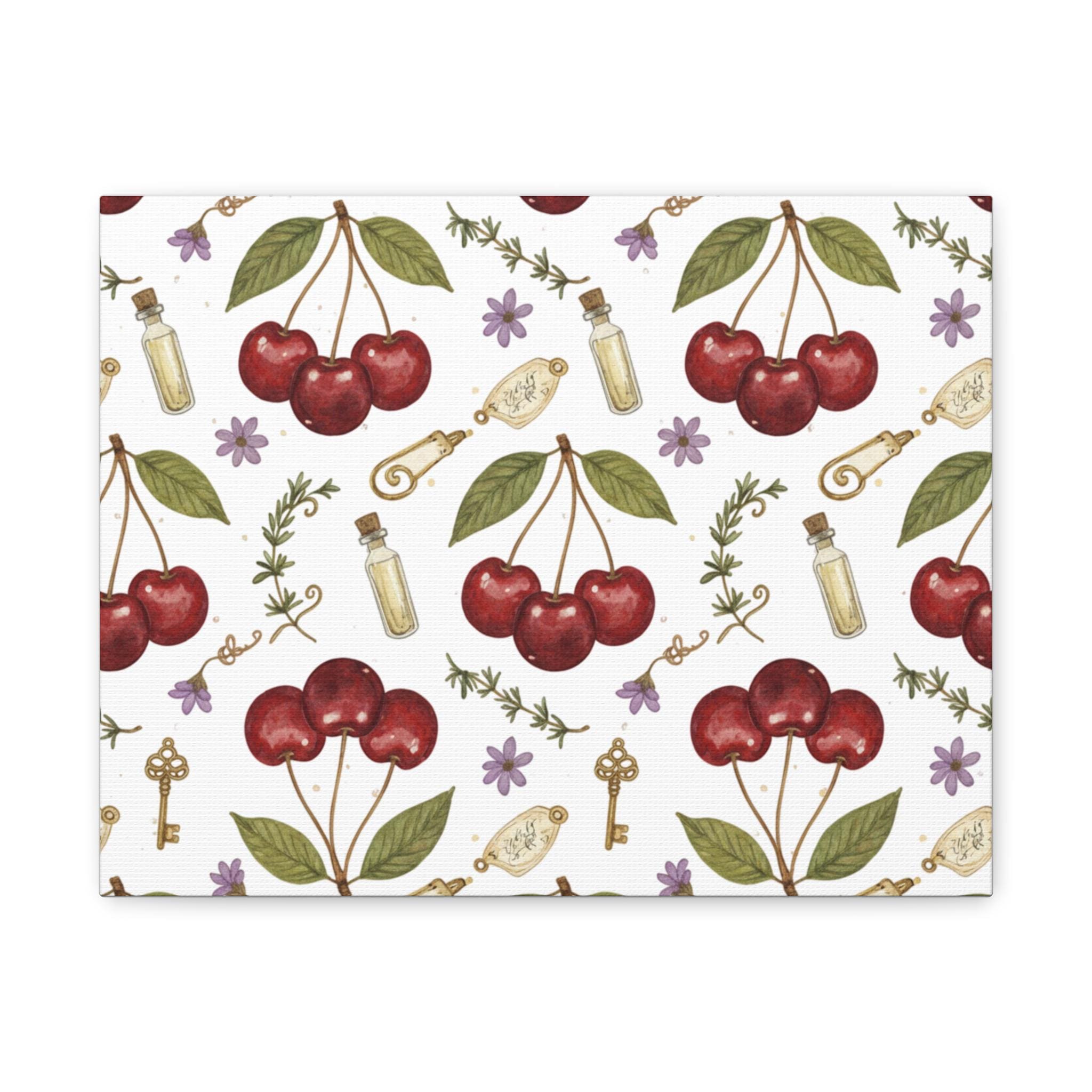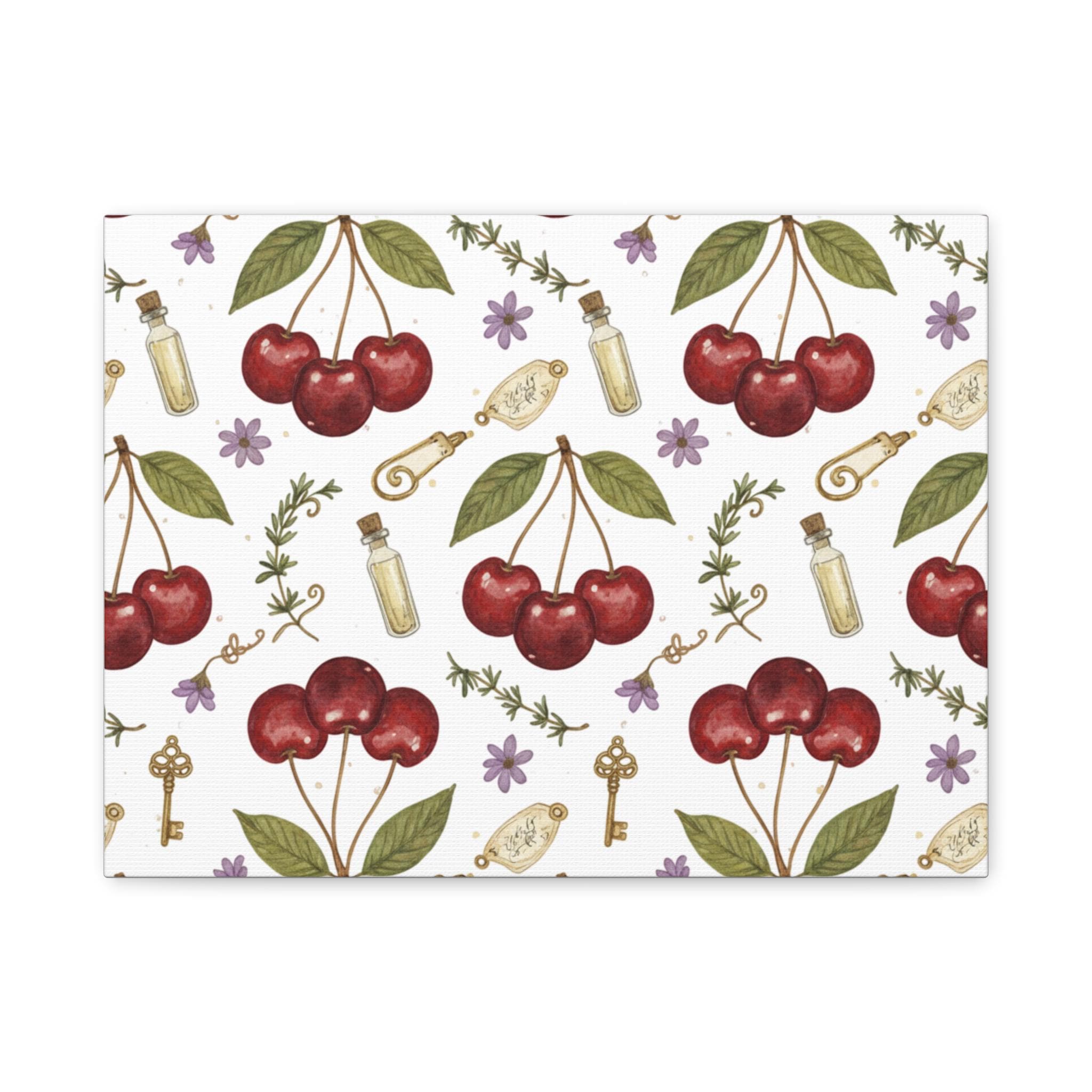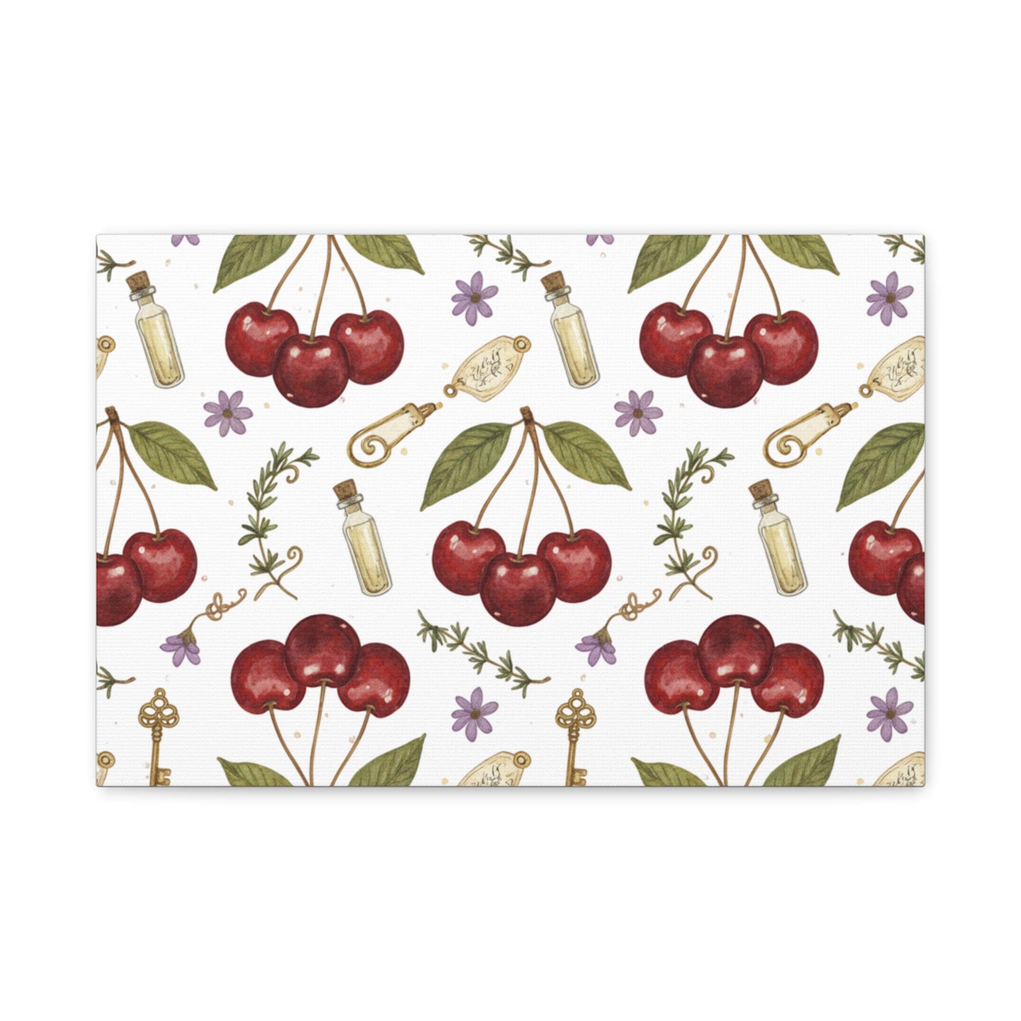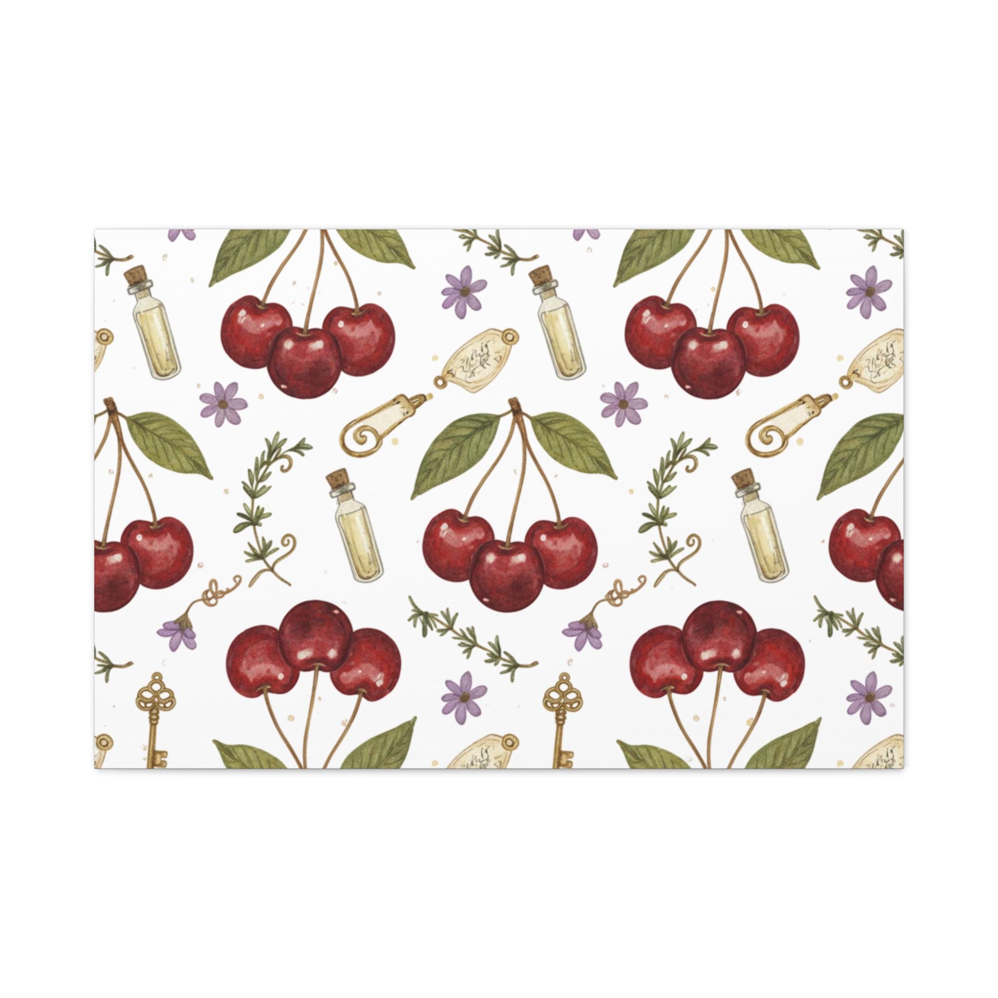 Retro-inspired cherry pattern on a matte stretched canvas that channels the Cherries / Fruit Motifs trend with a bright, nostalgic mood. Hand-drawn cherry clusters, leafy accents and small botanical doodles sit against a soft white ground, giving a clean, kawaii-tinged vintage feel that works as wall art for kitchens, reading nooks, or cozy cafés. The compact repeat design reads well from a distance while revealing charming details up close, making it a cheerful, year‑round decorative piece for fans of simple, fruit-forward graphics.