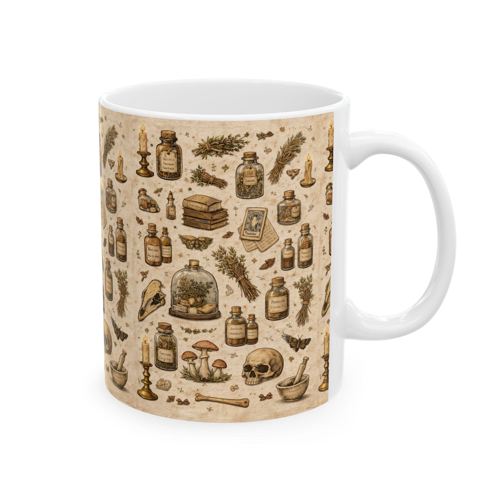Made to be used every day, the mug is sturdy enough for frequent use while keeping the printed artwork vibrant. It sits comfortably in hand with a classic C-handle, and works smoothly with your daily routine whether you heat or clean it in modern kitchens. This piece fits lives that favor curiosity over clutter—folklore readers, herb growers, collectors of oddities, and anyone who likes a quiet, atmospheric start to the day. Bring it to a slow weekend morning, a late-night study session, or place it on display among objects that tell stories.